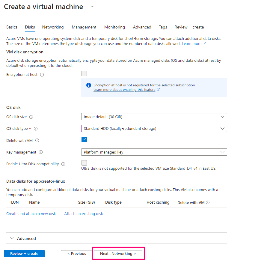 Step 9: Select the OS disk type as Standard HDD and click the Next: Networking > button.