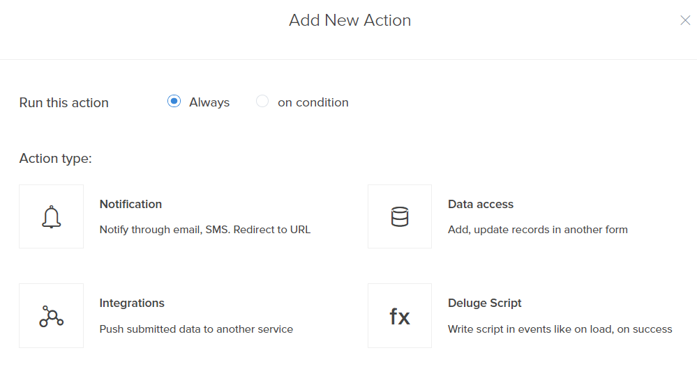 - The Add New Action window will slide in from the right. Set the condition and choose the action type from here.