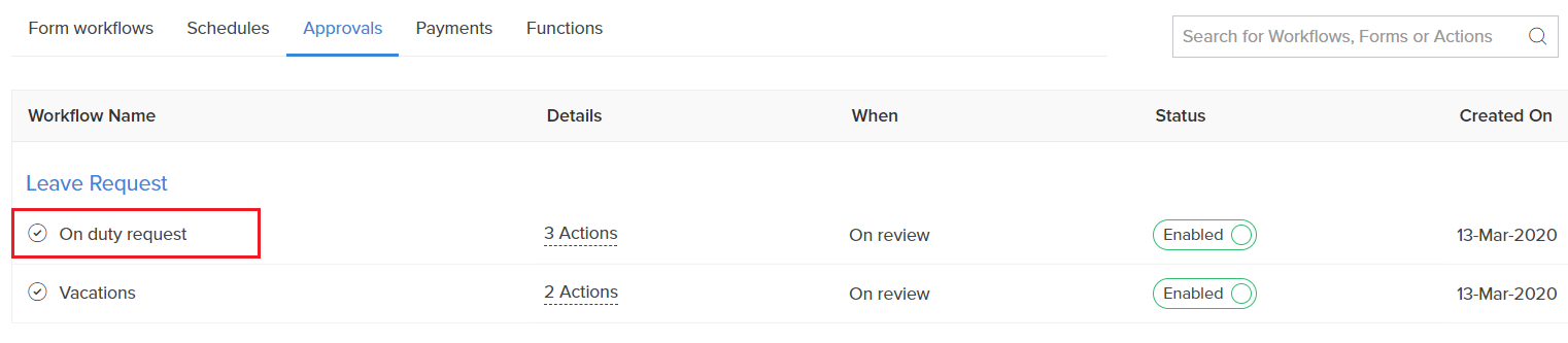 - Navigate to the Approvals tab on the Workflows page. The page will list all the preconfigured approval workflows.