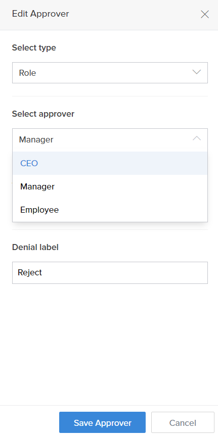 - You can change the approver type and select the approver. Click Save Approver after making the required changes.