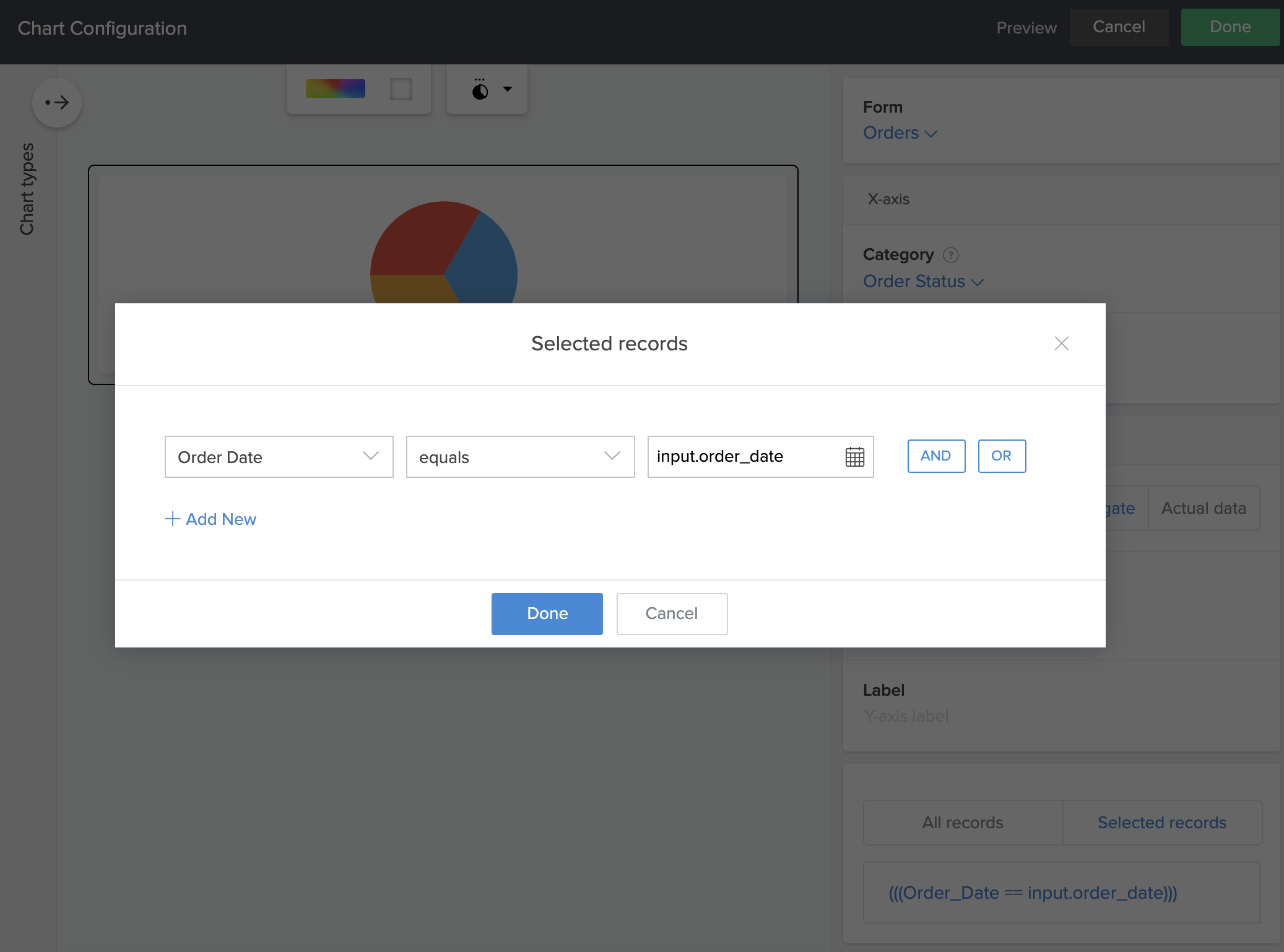 Imagine you've created an application called Order Management. In this application, you have designed a page titled Dashboard and added a pie-chart that is configured to display the status of orders, along with the count of total orders on a particular day. Now, while setting the filter for Selected records, you can specify the parameter name in the place of value. Here, the parameter name is order_date.