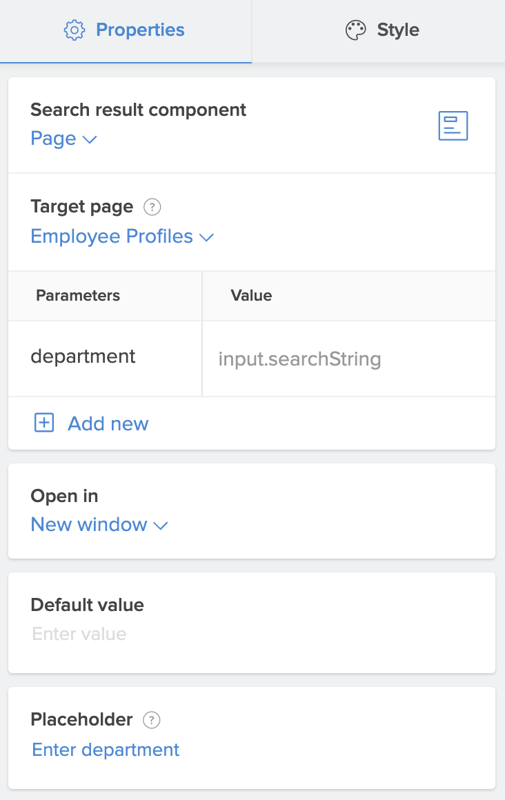 - For the search component, you can select the parameter based on which you want to display the search results. Here, department is the page parameter.