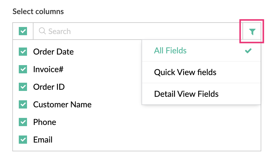 - Click the filter icon at the top-right of the popup to select columns based on view types — Quick View and Detail View. You can also select the All Fields option from here.