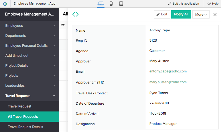 Let's assume, you have an employee management application that has employee related information. In a report that maintains travel requests, the details include the name, designation, and department of the employee who initiated the request, the manager who approves the request, destination, period of travel, the customer/partner/vendor who the employee will meet, and the travel desk that facilitates the journey. Let's say there is action item called Notify in the record. On completing the arrangements for the travel, the travel desk person will have to provide intimation to the concerned employee and the manager. The predefined menu item encapsulates a workflow that triggers email notifications to the concerned parties with details of the travel date and the complete schedule for the travel. When the travel desk person clicks the Notify All button, the intimation email gets sent to the employee, the manager, and the customer.