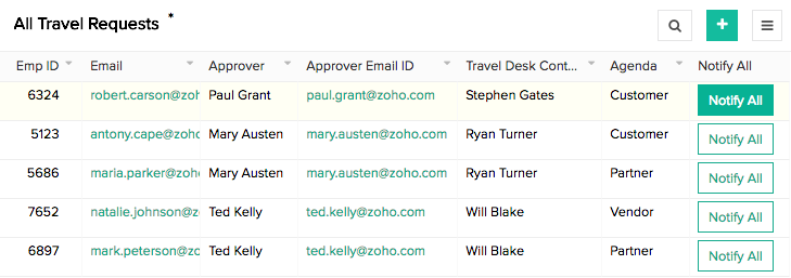Let's assume, you have an employee management application that has employee related information. In a report that maintains travel requests, the details include the name, designation, and department of the employee who initiated the request, the manager who approves the request, destination, period of travel, the customer/partner/vendor who the employee will meet, and the travel desk that facilitates the journey. Let's say there is action item called Notify All in the report. On completing the arrangements for the travel, the travel desk person will have to provide intimation to the concerned employee and the manager. The predefined menu item encapsulates a workflow that triggers email notifications to the concerned parties with details of the travel date and the complete schedule for the travel. When the travel desk person clicks the Notify All button, the intimation email gets sent to the employee, the manager, and the customer.