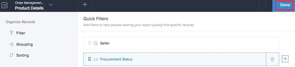 Quick filters can be included in the report builder, which in turn will be reflected in the report. The users can apply the required filter to the complete data in the report, then narrow down to the records that they wish to view.