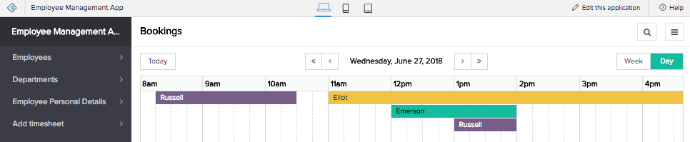 Let's assume that you have many conference rooms in your workplace. You have a room booking application in place. The corresponding timeline report presents the booking details in Week and Day views, respectively. The records have a predefined grouping that is based on the field that captures the names of the rooms. Thus, the records are classified into timelines of bookings of each room. Selecting Day view displays the records in that day. Rooms booked for the day will be displayed including the time span of each booking. Similarly, selecting Week view will display the records for the chosen week.