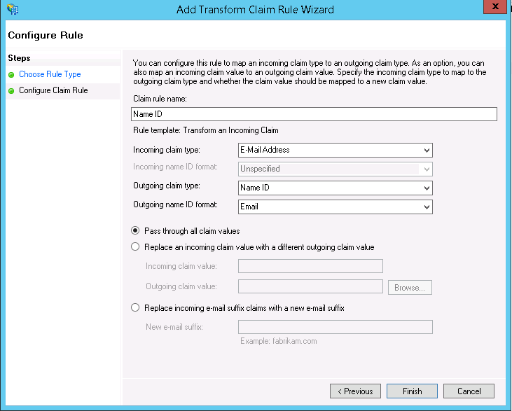 • Choose E-Mail Address as the Incoming claim type from the drop-down menu.