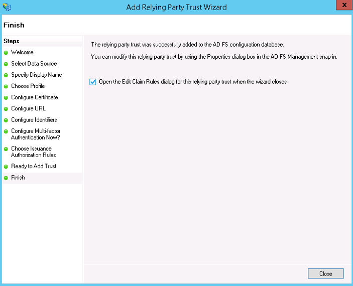 After the relying party trust is created, you can create claim rules. By default, the claim rule editor opens once you create a trust.