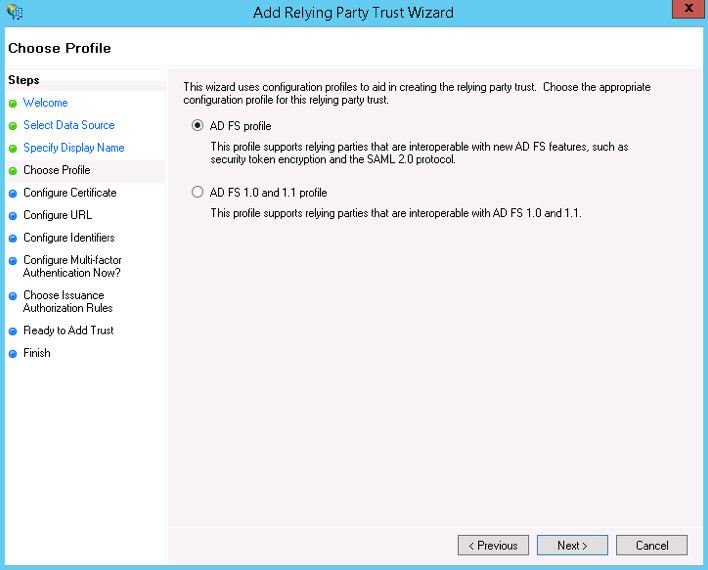 4. Select AD FS profile on the Choose Profile screen and click Next.