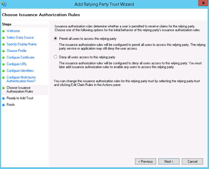9. Select the Permit all users to access this relying party button on the Choose Issuance Authorization Rules screen.
