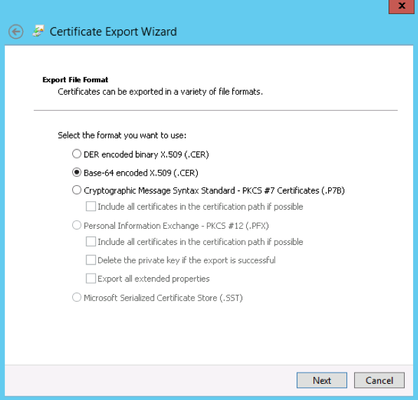 • Select Base-64 encoded X.509 (.cer), then click Next.