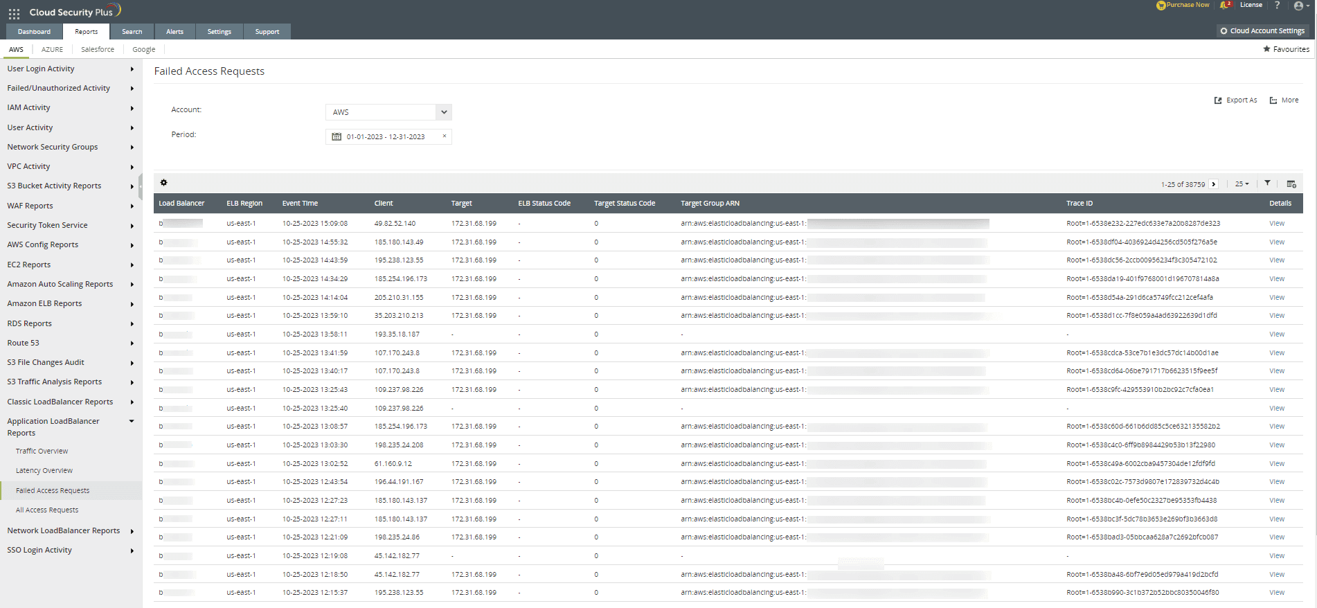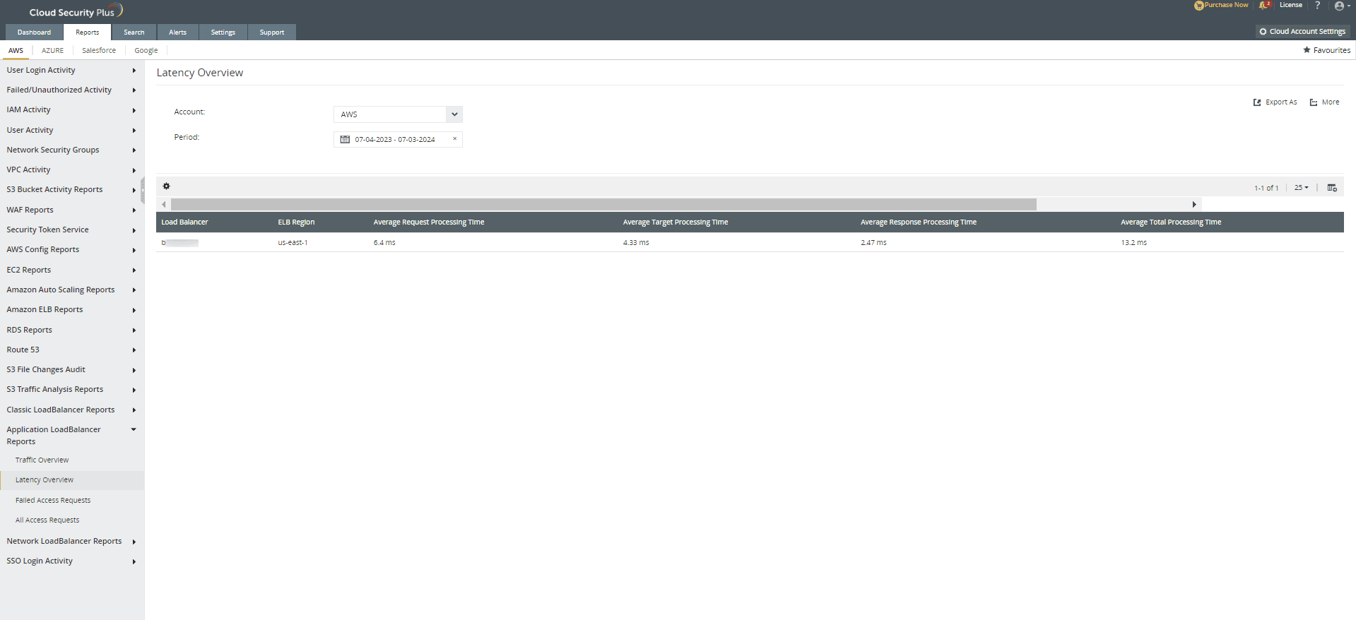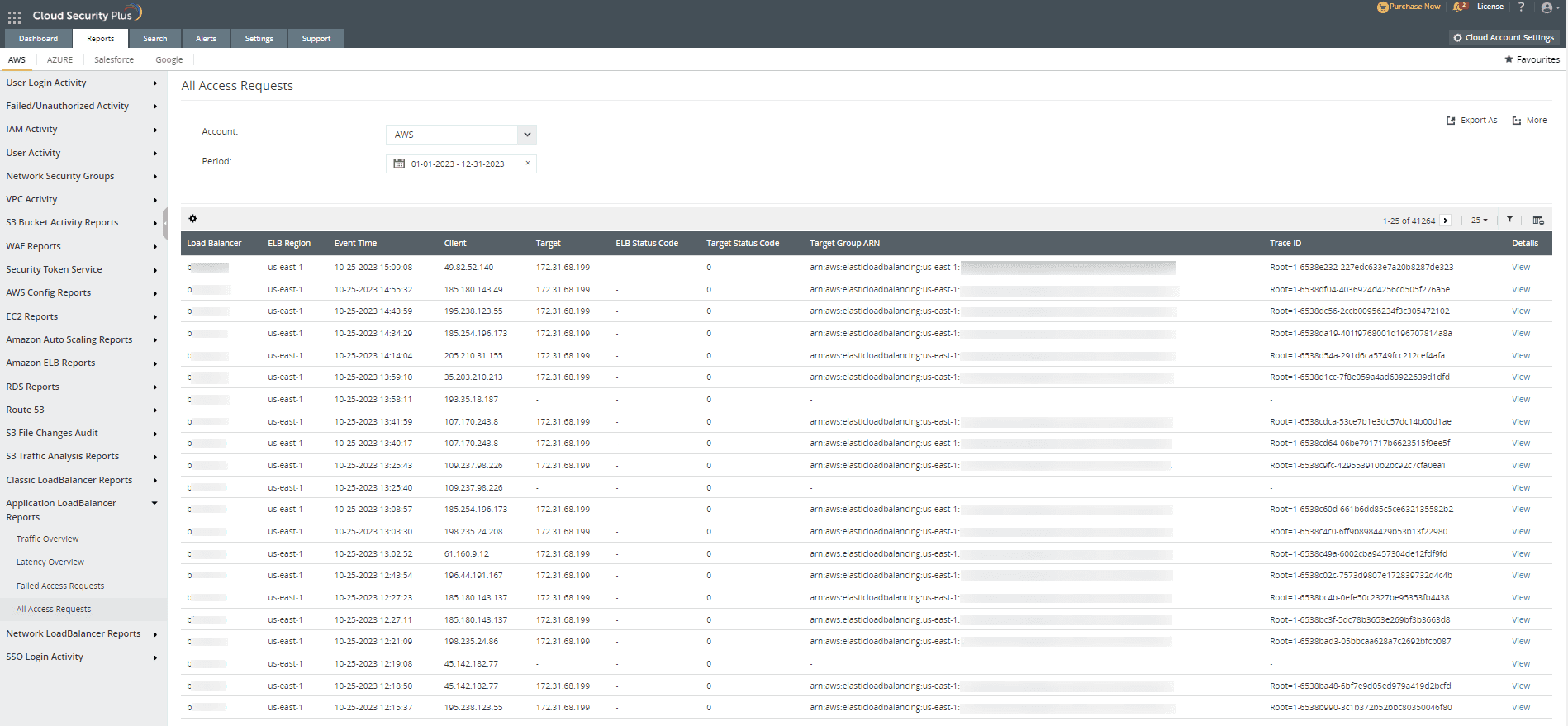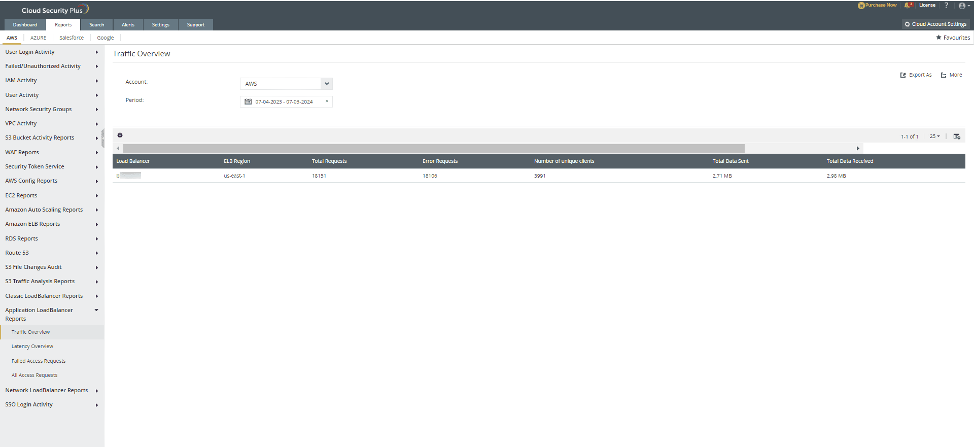 Cloud Security Plus reads ELB access logs from the S3 bucket, and uses that information to generate reports on the traffic running through the load balancer. With Cloud Security Plus' reports, you can analyze traffic patterns and monitor the operational efficiency of your ELB.