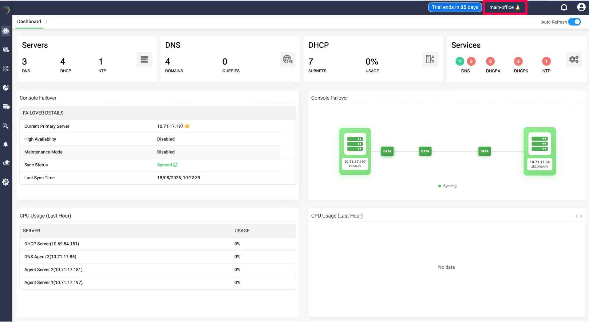 Upon successful signup, the first glimpse within the DDI console reveals an empty dashboard. To get started, create clusters and add your DNS and DHCP servers to your clusters for effective management of your network infrastructure.
