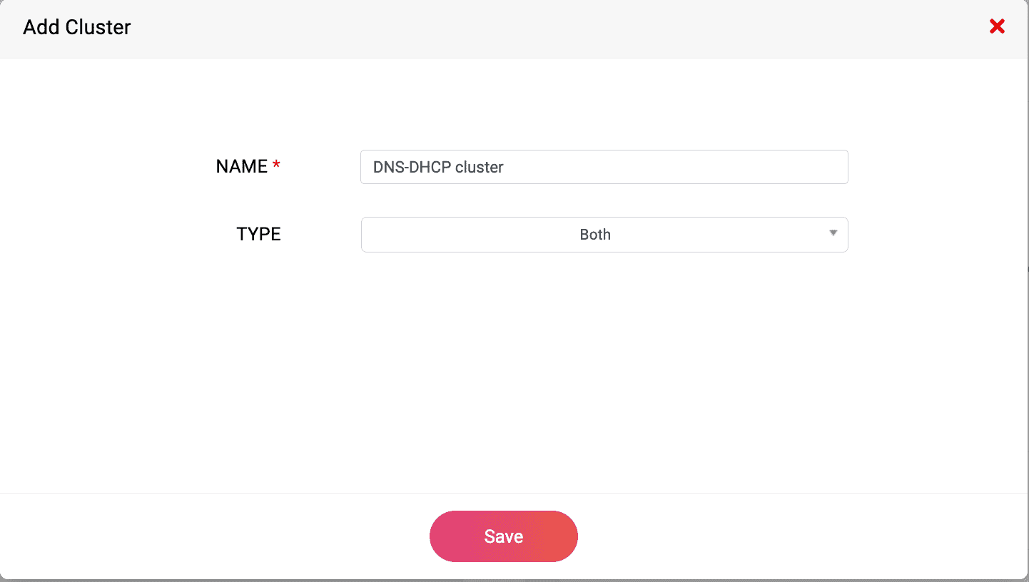 - The Add Cluster window appears prompting you to enter the name and type of the cluster: DNS, DHCP or Both. Selecting either DNS or DHCP will create a cluster dedicated only for DNS servers or DHCP servers, respectively. Selecting both enables you to add both DNS and DHCP servers into the cluster.