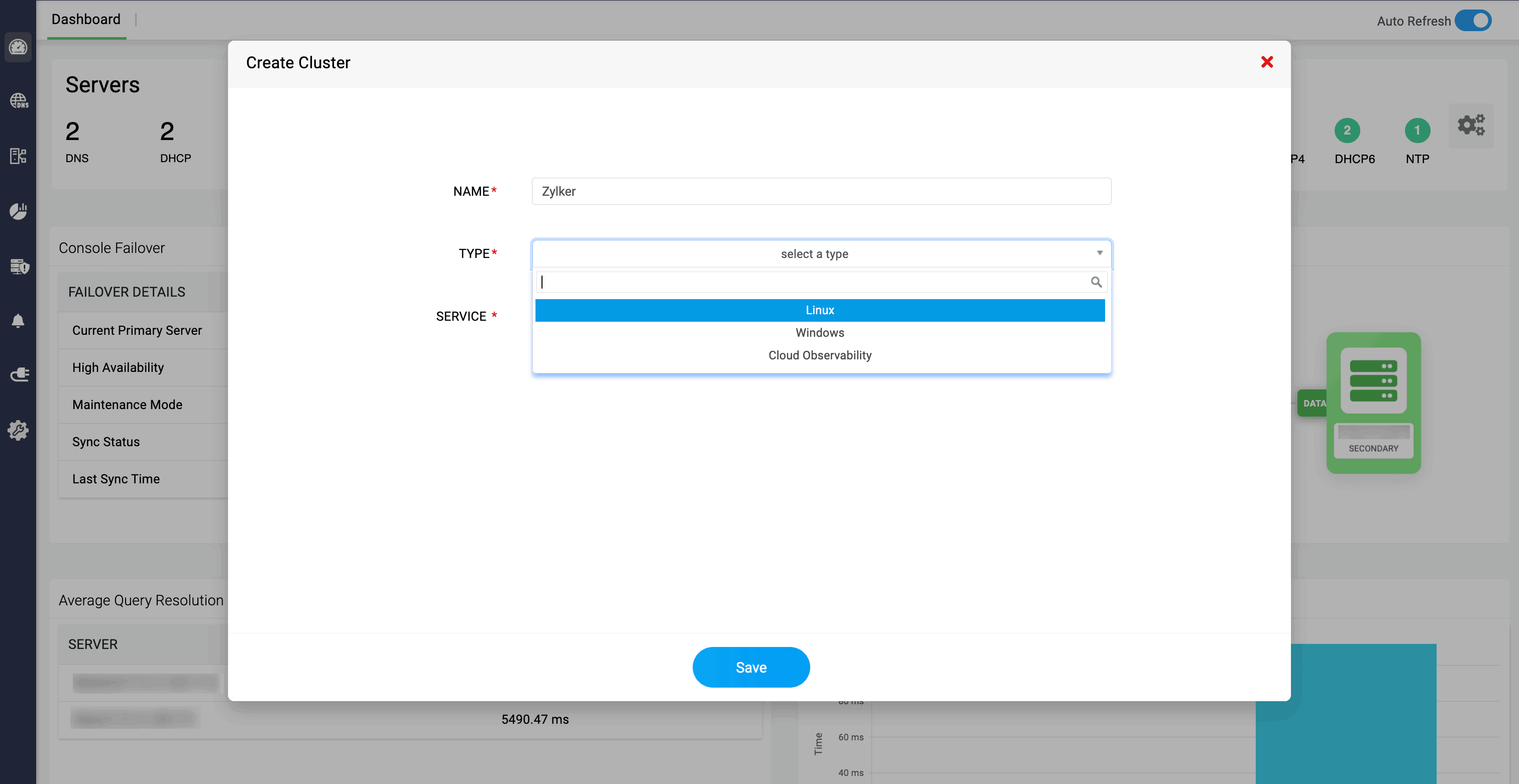 The Add Cluster window appears prompting you to enter the name and type of the cluster: DNS, DHCP or Both. Selecting either DNS or DHCP will create a cluster dedicated only for DNS servers or DHCP servers, respectively. Selecting both enables you to add both DNS and DHCP servers into the cluster.