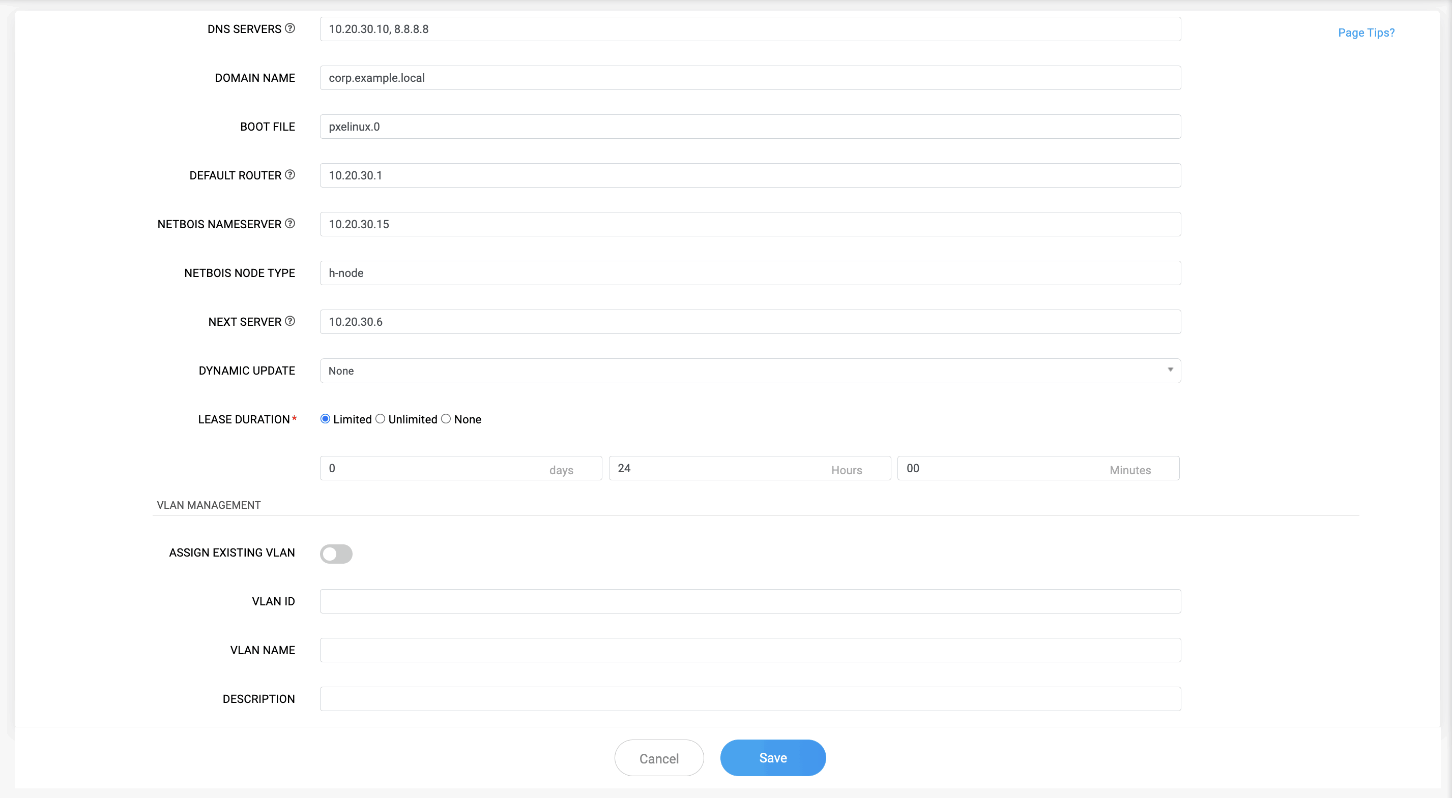 DYNAMIC UPDATE: Indicates whether dynamic updates are enabled for DHCP leases to automatically register client hostnames.
