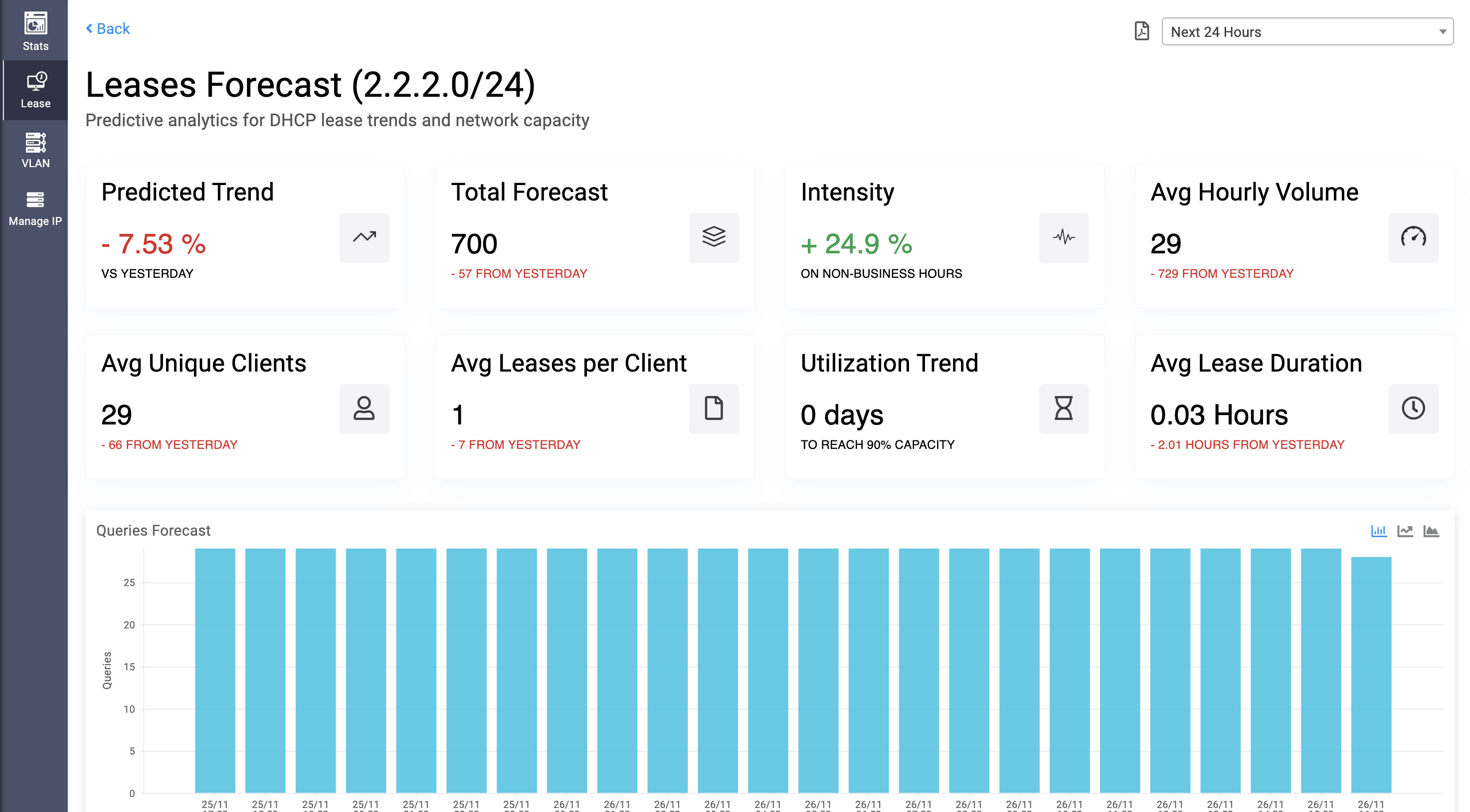 - strong>Average Leases per Client: Average increase or decrease in DHCP leases leased per every client that is predicted based on the historical data.