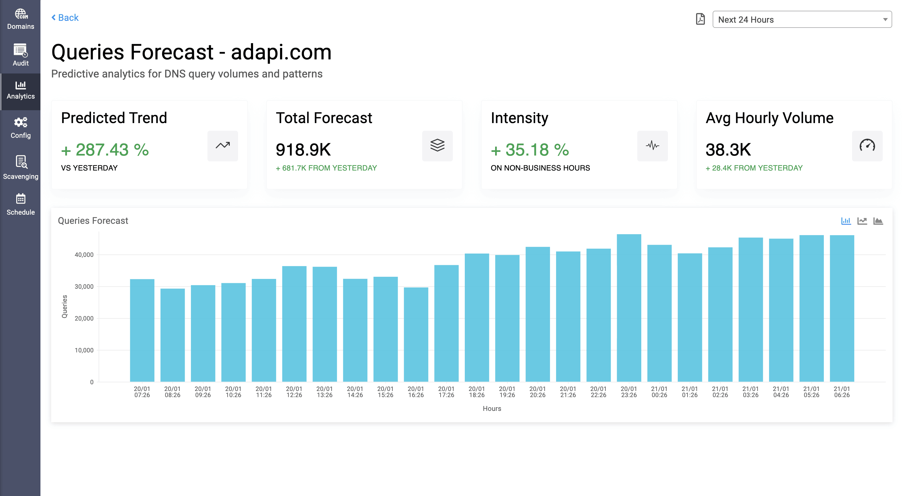 DNS query forecasting data can be exported as PDF.