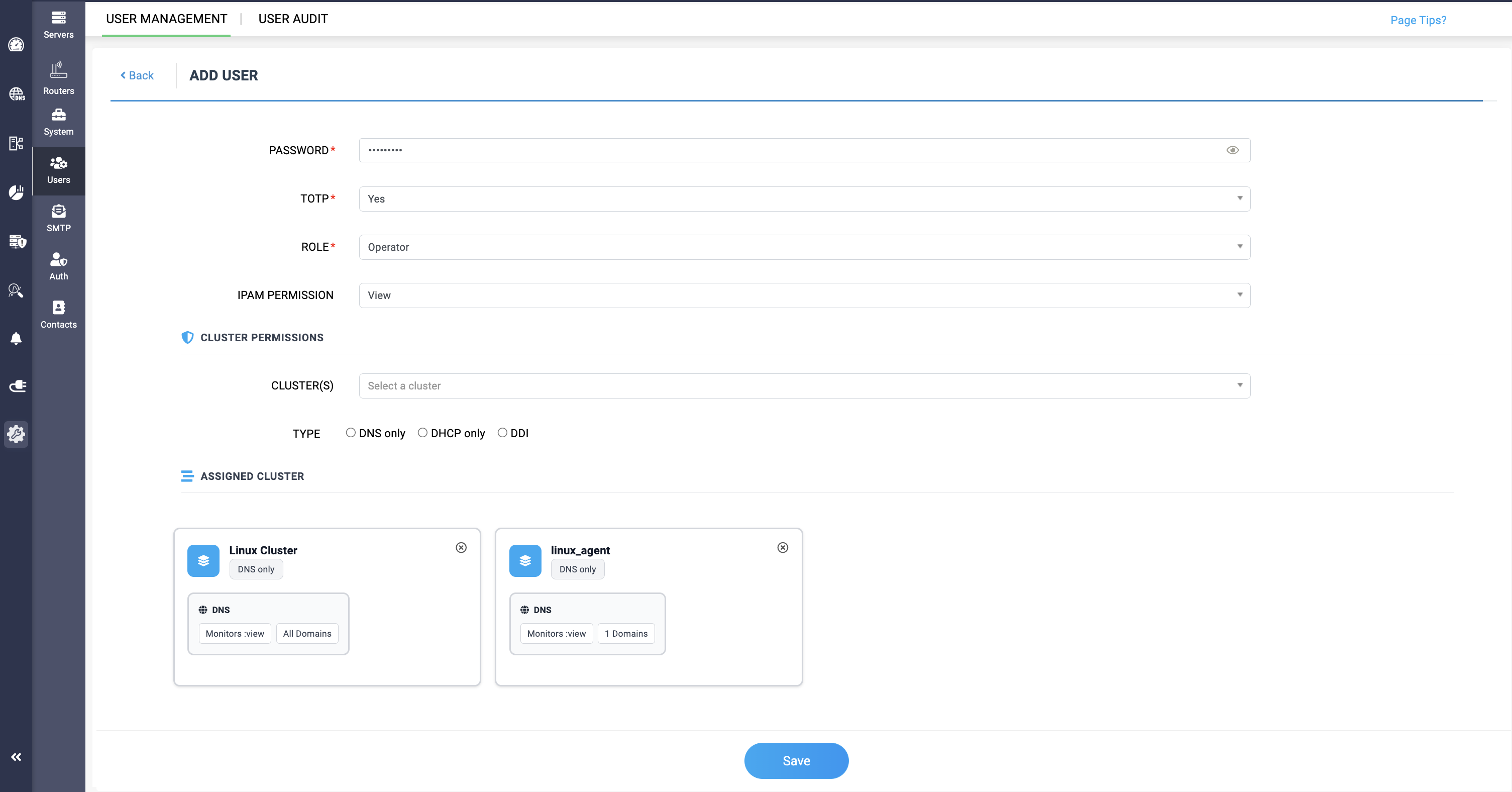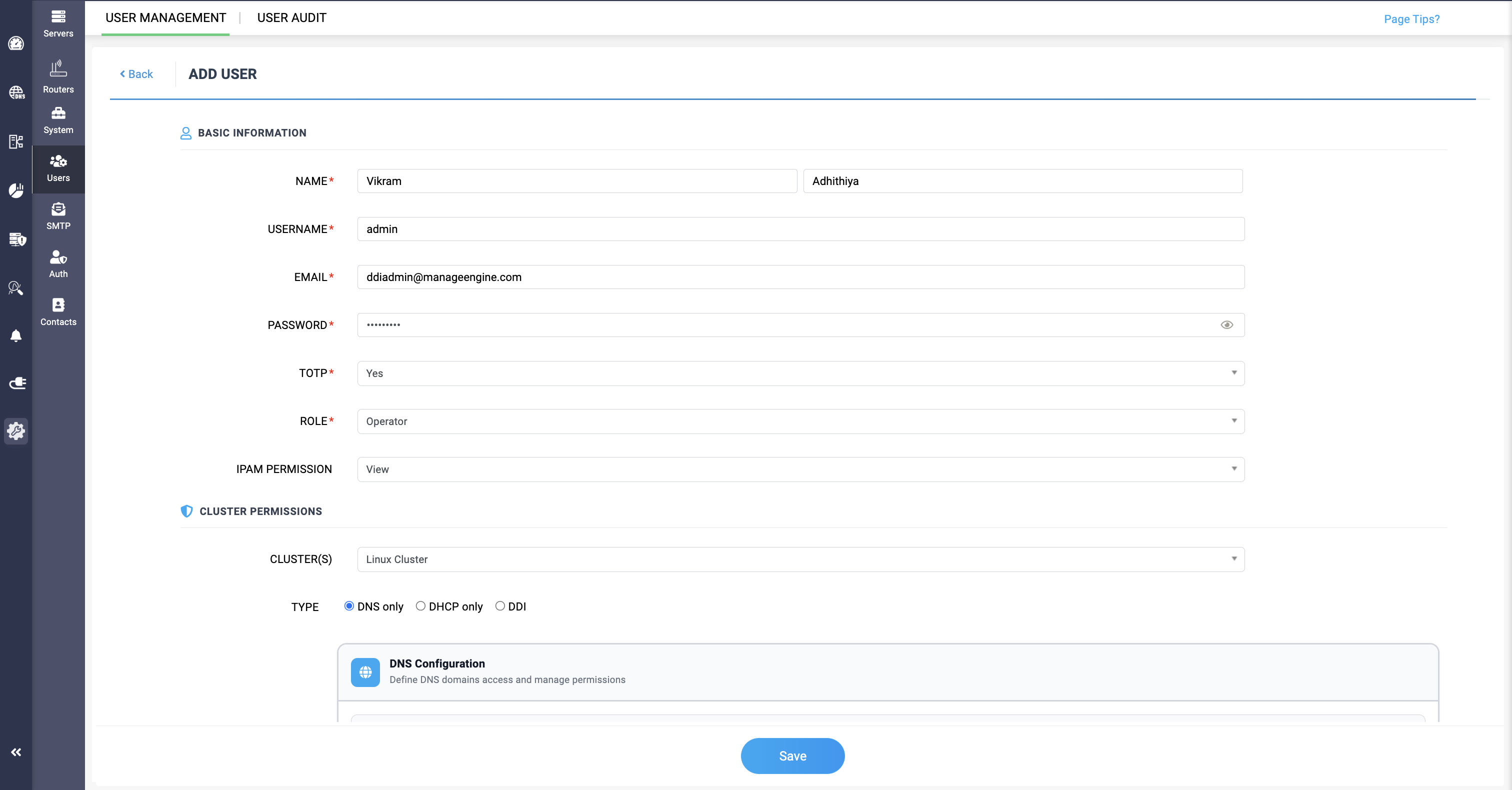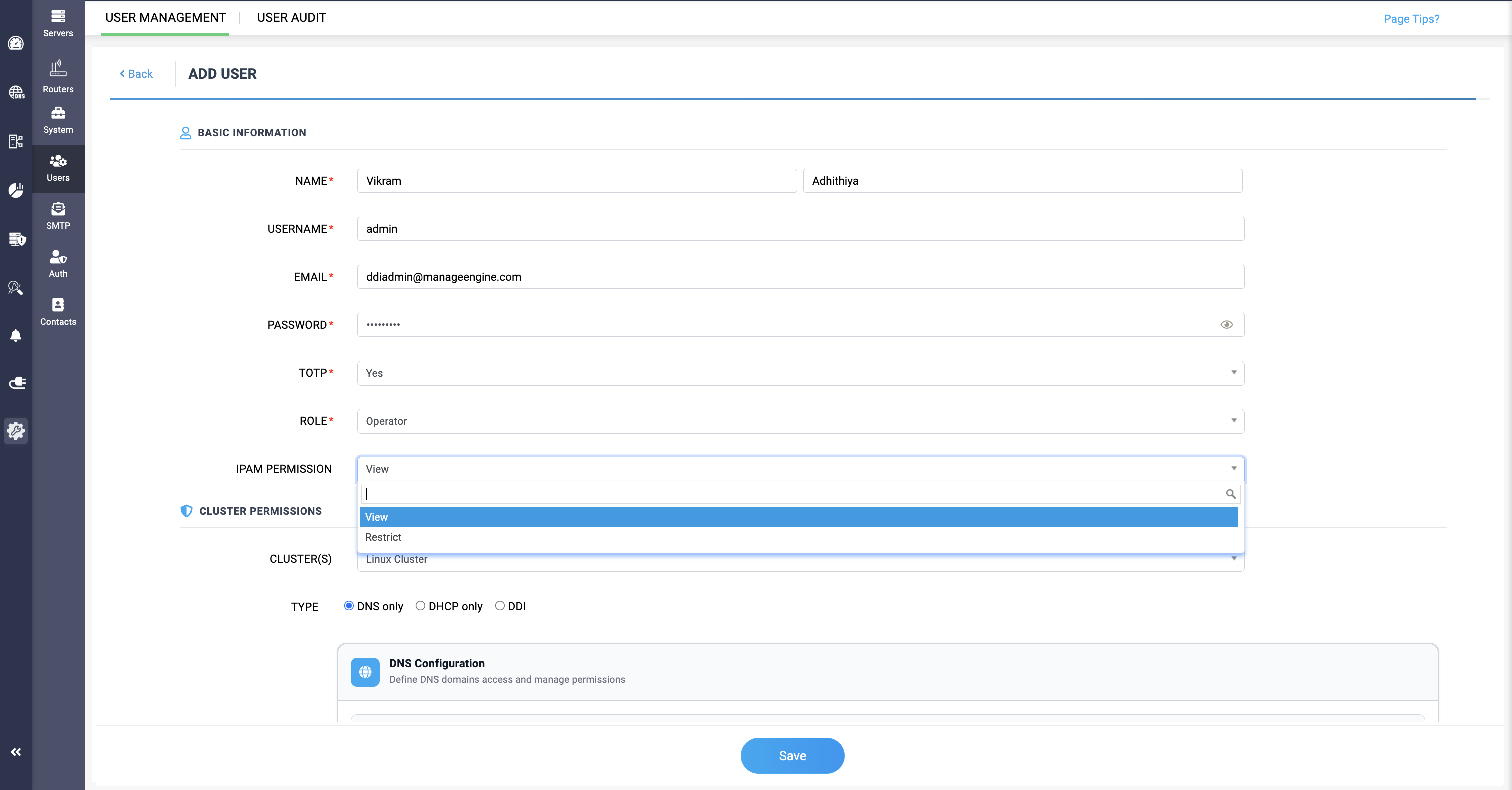 Under the DNS configuration section we have MONITOR PERMISSIONS, where you can prevent the user for accessing the monitors with RESTRICT option, or you can just let them view the monitors in the network with VIEW option, or you can allow them to edit the monitors with the EDIT option.In the DNS domains section, you can select ALL for granting access to all the domains in the network, or select SELECT ZONES option for granting access to certain domains in the selected zone.