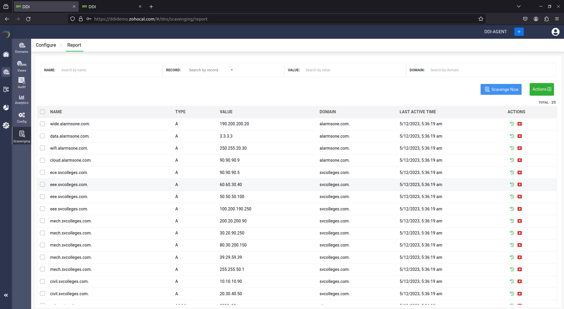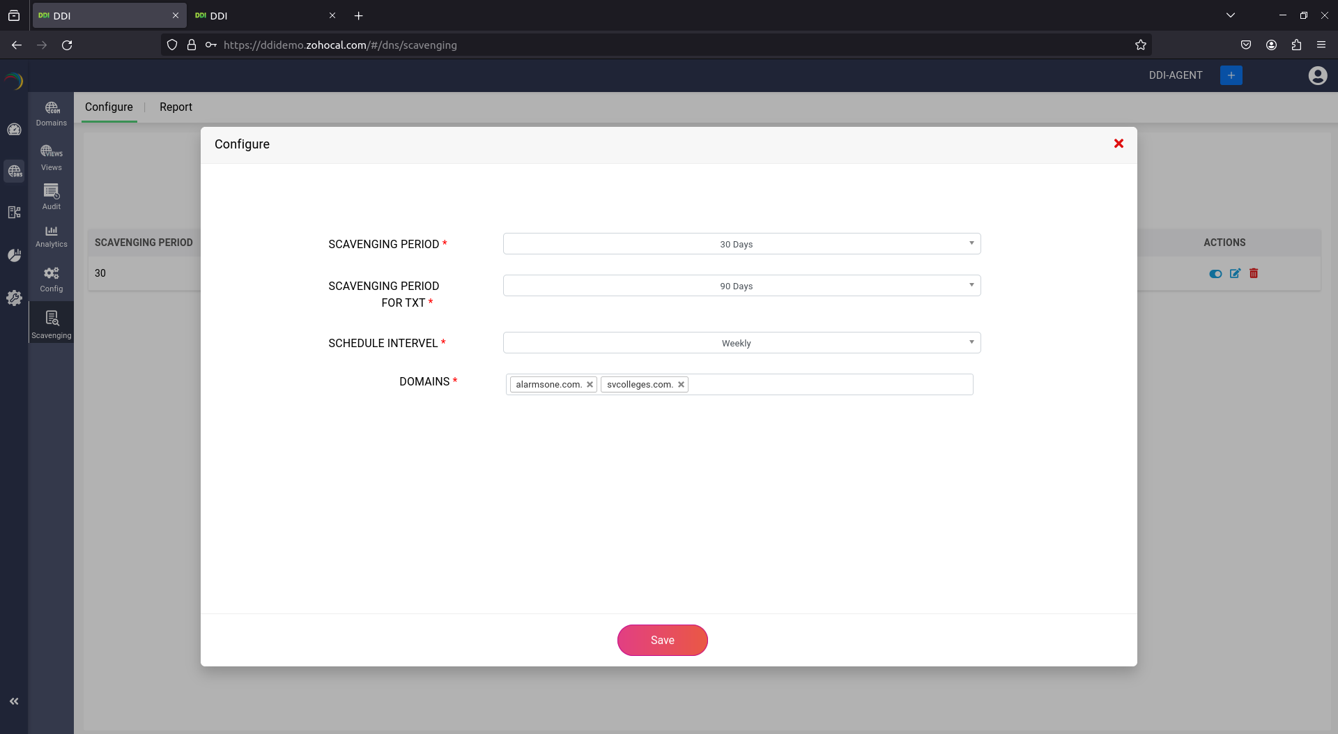 - On the Configure window that appears, the top field SCAVENGING PERIOD is meant for all the A, AAAA. CNAME, PTR of the domains selected. This is the duration after which a DNS record becomes eligible for scavenging if it has not been refreshed. If the DNS record still remains un refreshed after this period, DNS server considers the record stale and eligible for deletion and put up in the report for the user to delete or reclaim it .