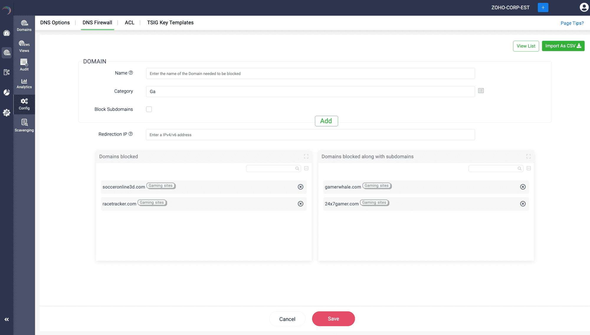- You can bulk import a customized list of malicious domains via CSV import for quicker addition. You can also block as many categories based on your organizational needs.