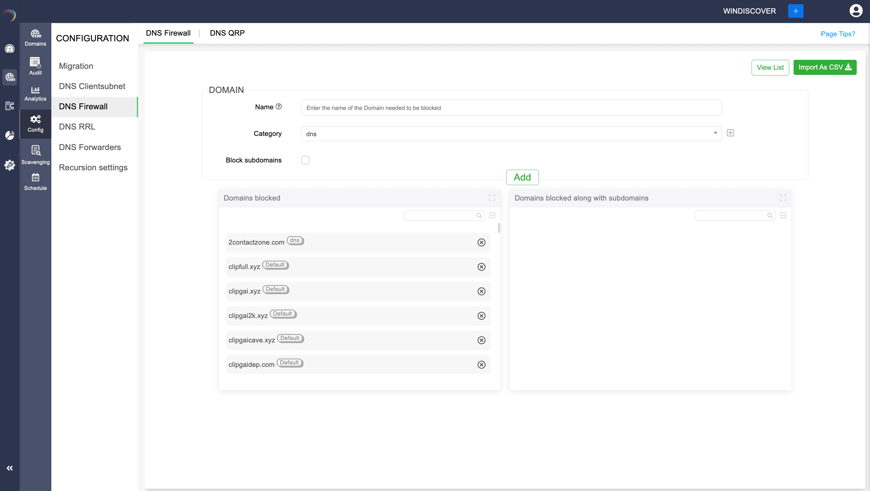 - Once you click Add, you will see two separate lists, one that says Domains Blocked and the other says Domains blocked along with subdomains. This way, you can build your categories of malicious domains on your own.