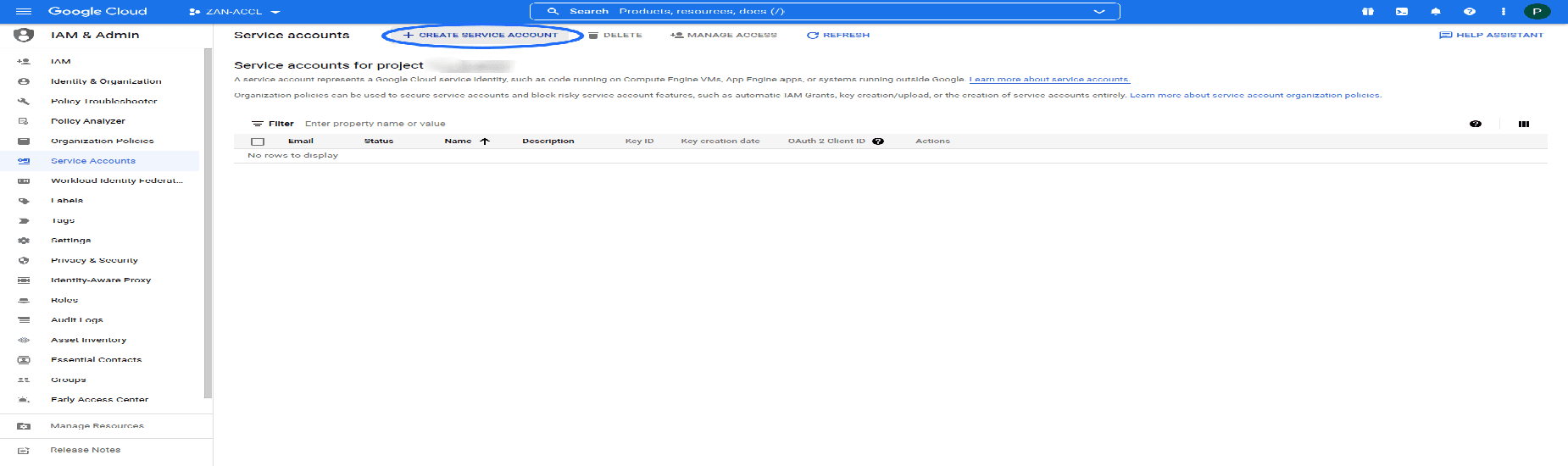 Login into your Google cloud account and Navigate to IAM & Admin -> Service Accounts