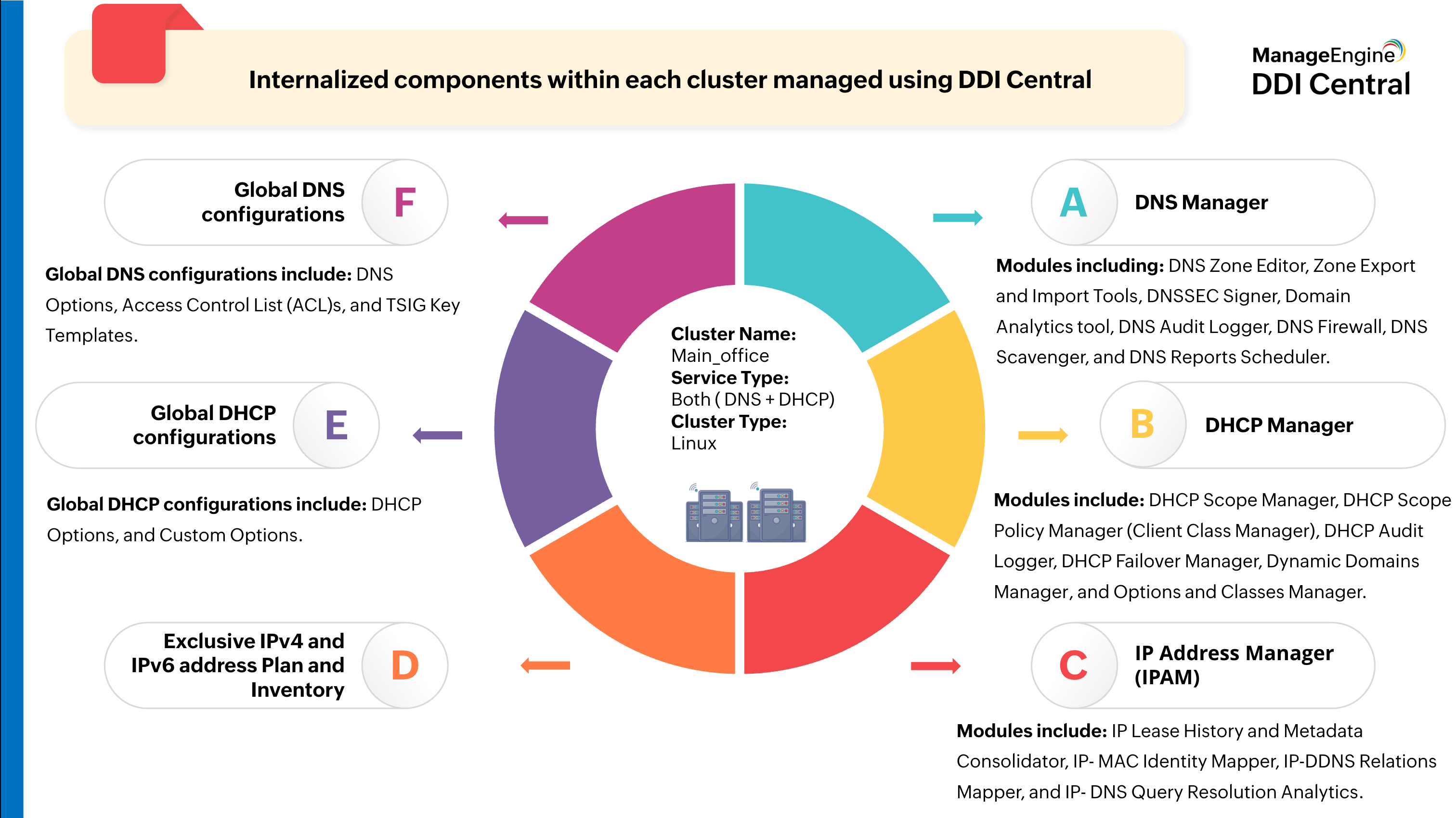 Each cluster is associated with its own DNS Manager, DHCP Manager, and IP Address Manager, enabling precise control over network services.