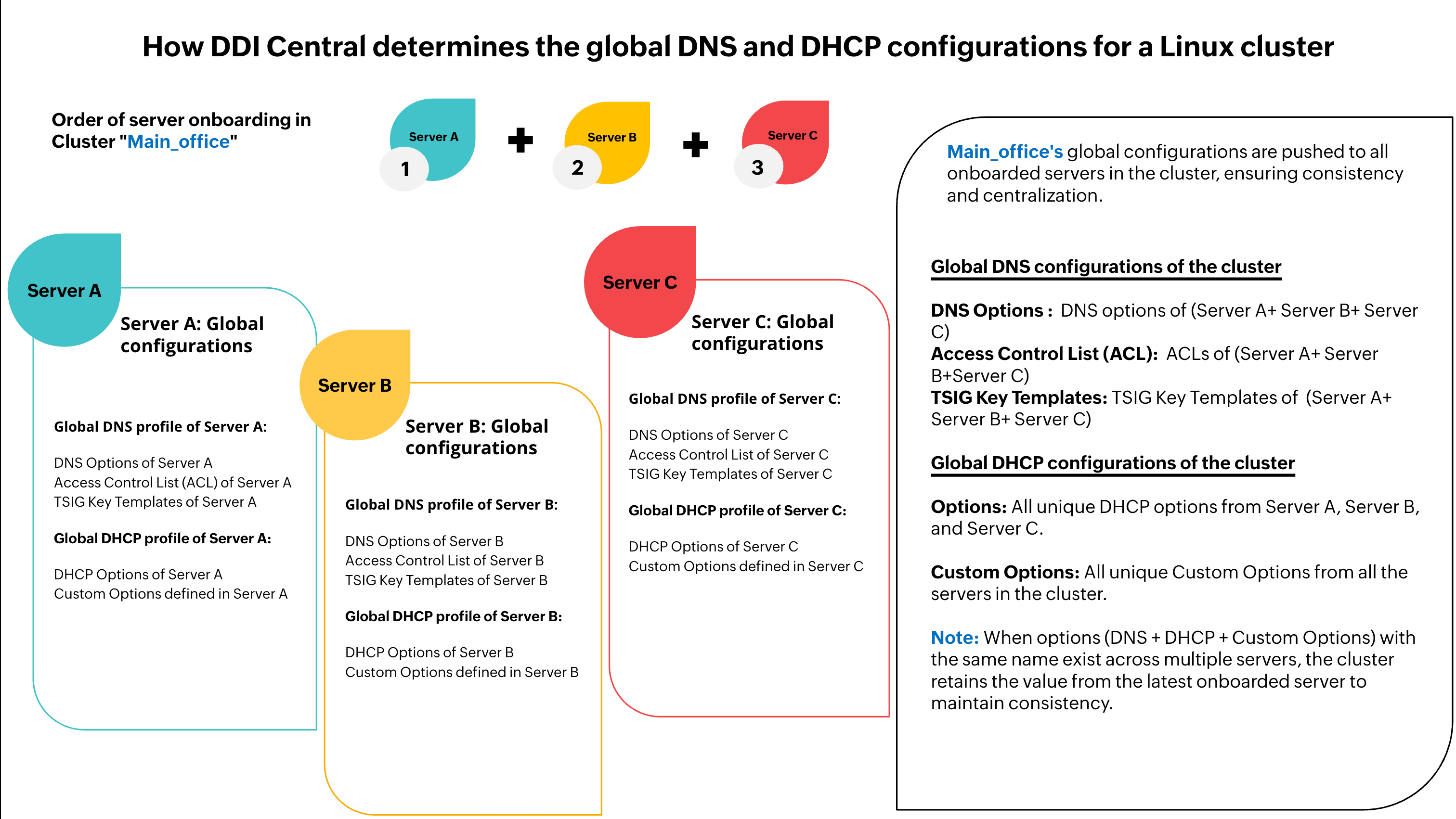 When servers are onboarded to a cluster, DDI Central aggregates the global configurations within each server using predefined rules: