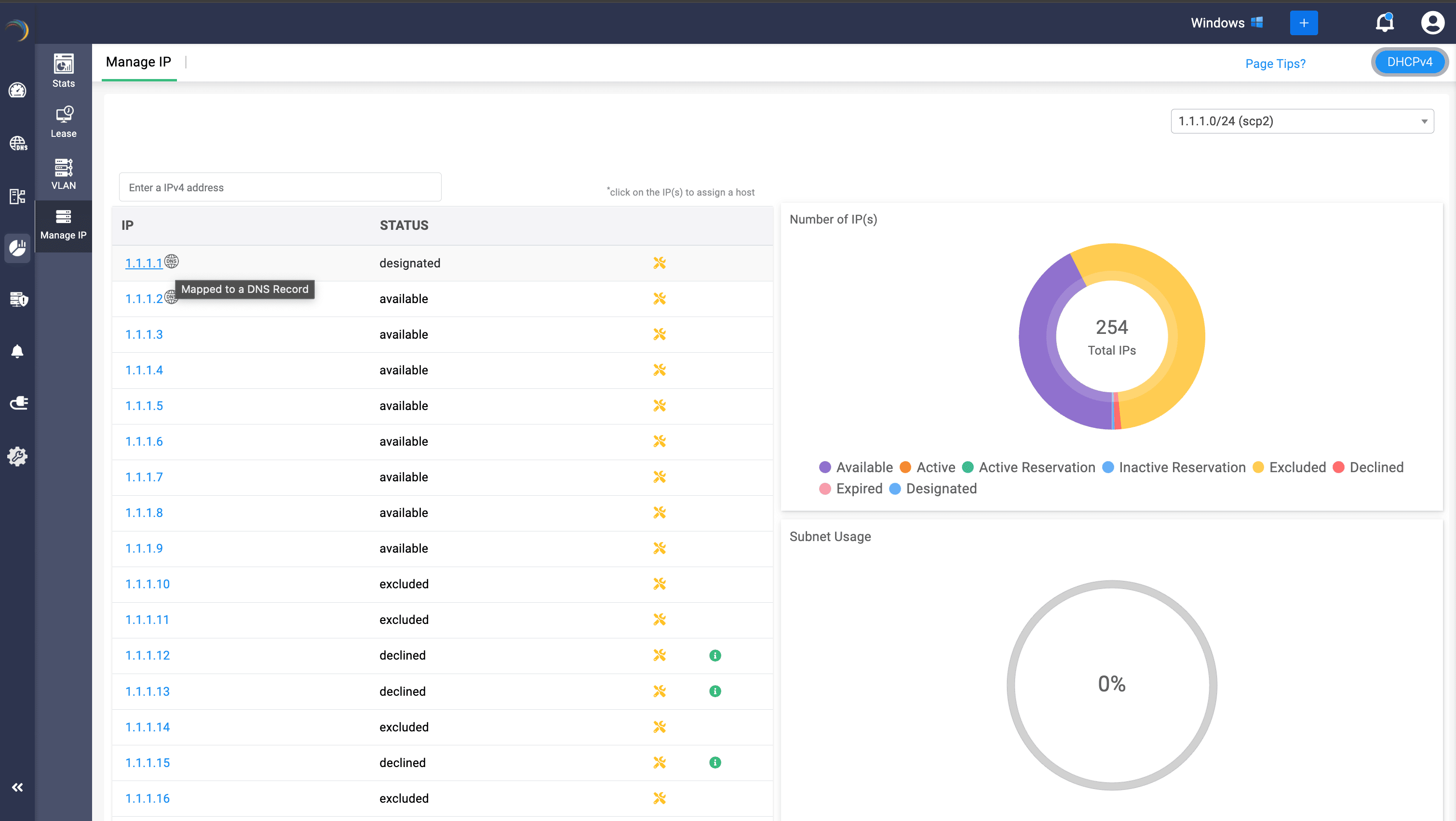 The third section-Subnet Usage, on the bottom right corner, illustrates the overall percentage of IP utilization within that subnet.