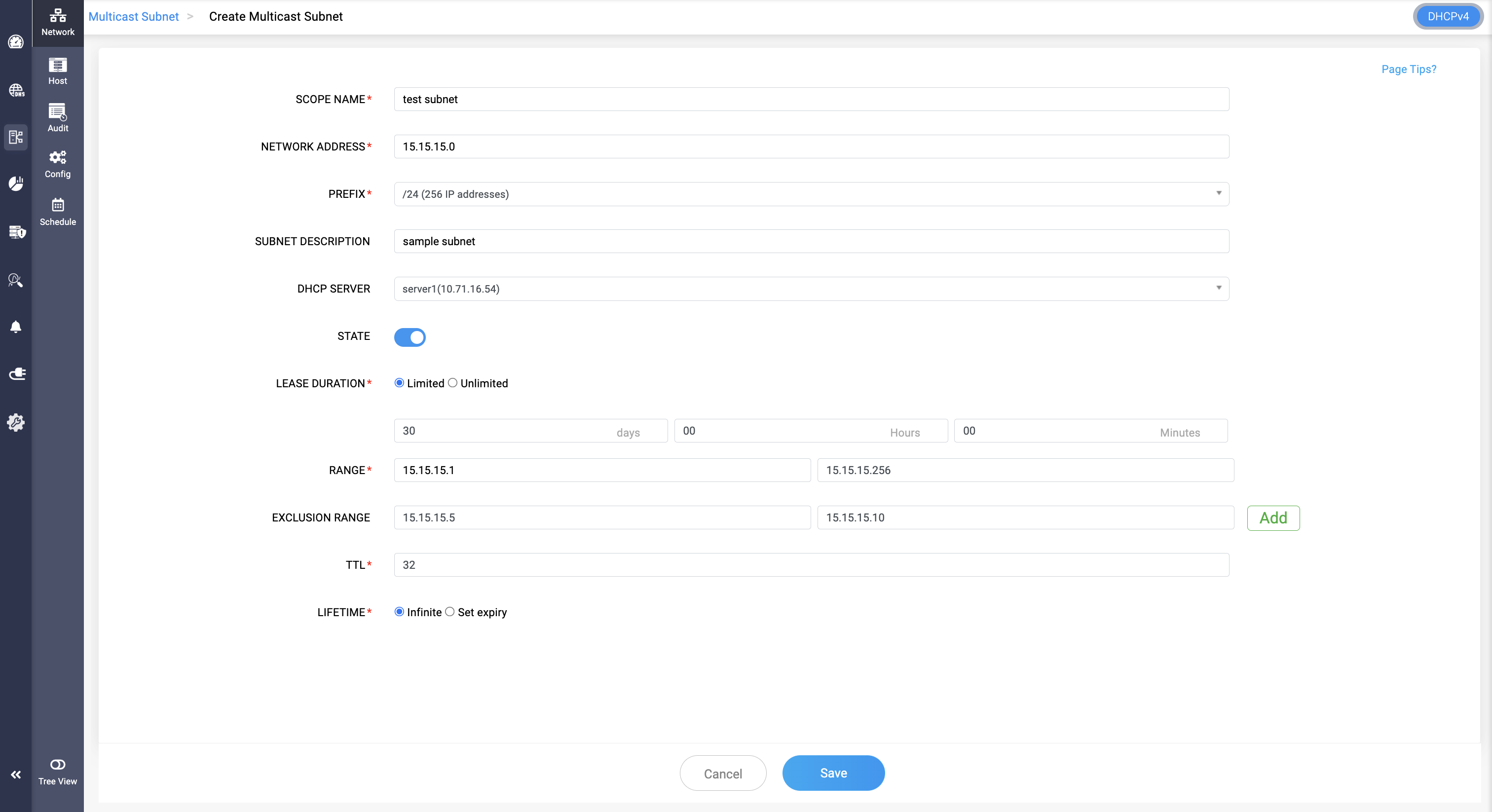Note: Multicast subnets can be unmanaged and managed from serving in the DHCP server by clicking on the Yellow icon and confirming to Unmanage the subnet.