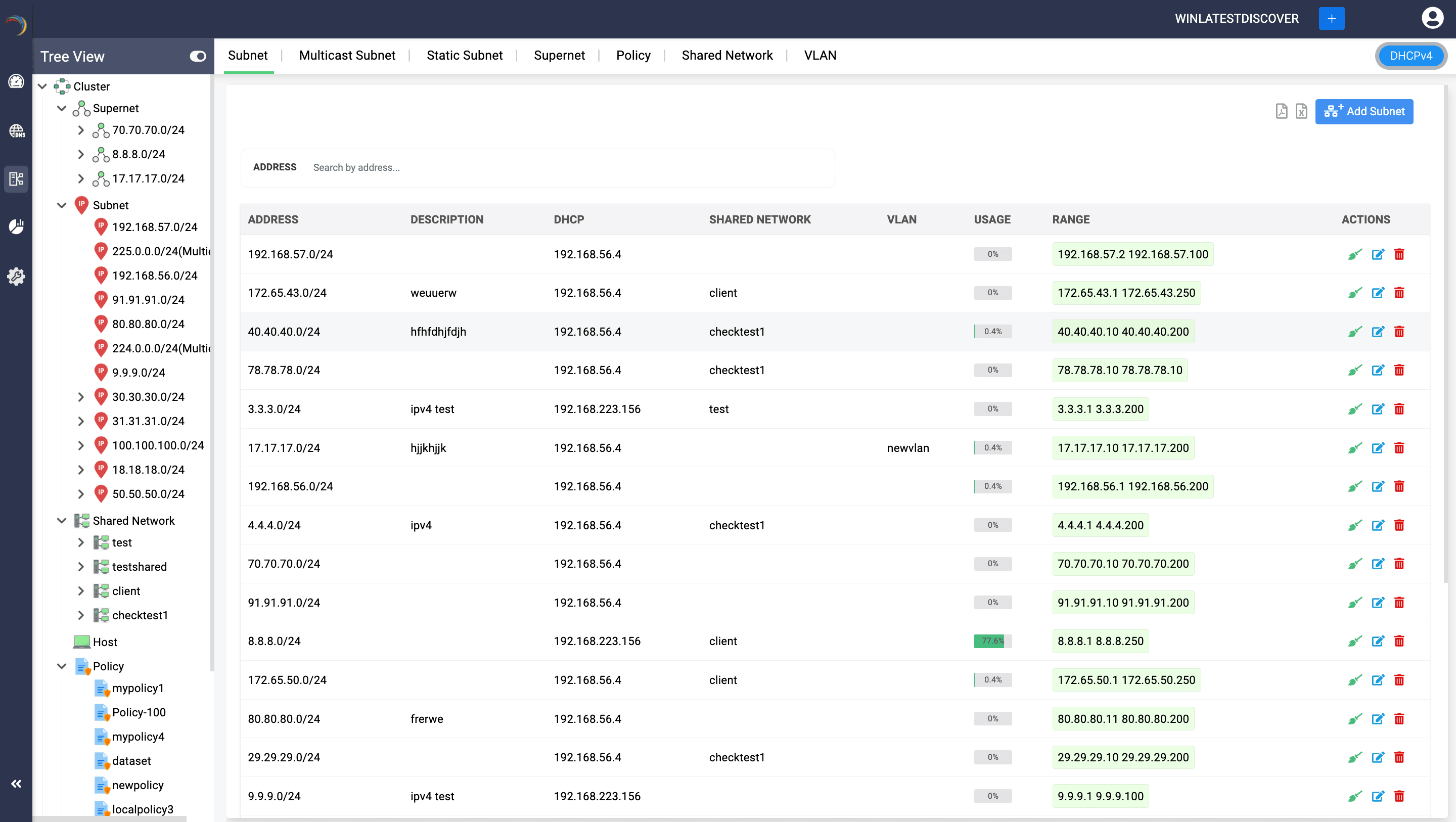 To create an IPv4 subnet, go to DHCP-> Network-> Subnet. Click Add Subnet button in the top right corner. Make sure DHCPv4 is selected from the toggle in the top right corner.