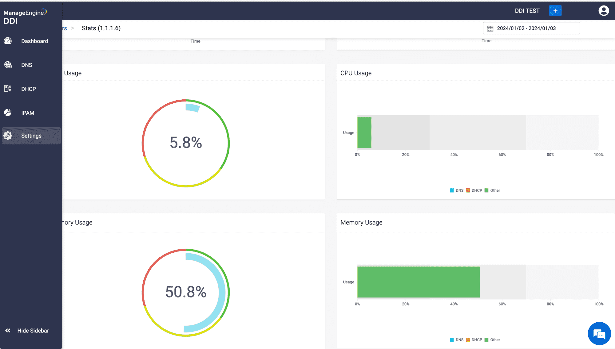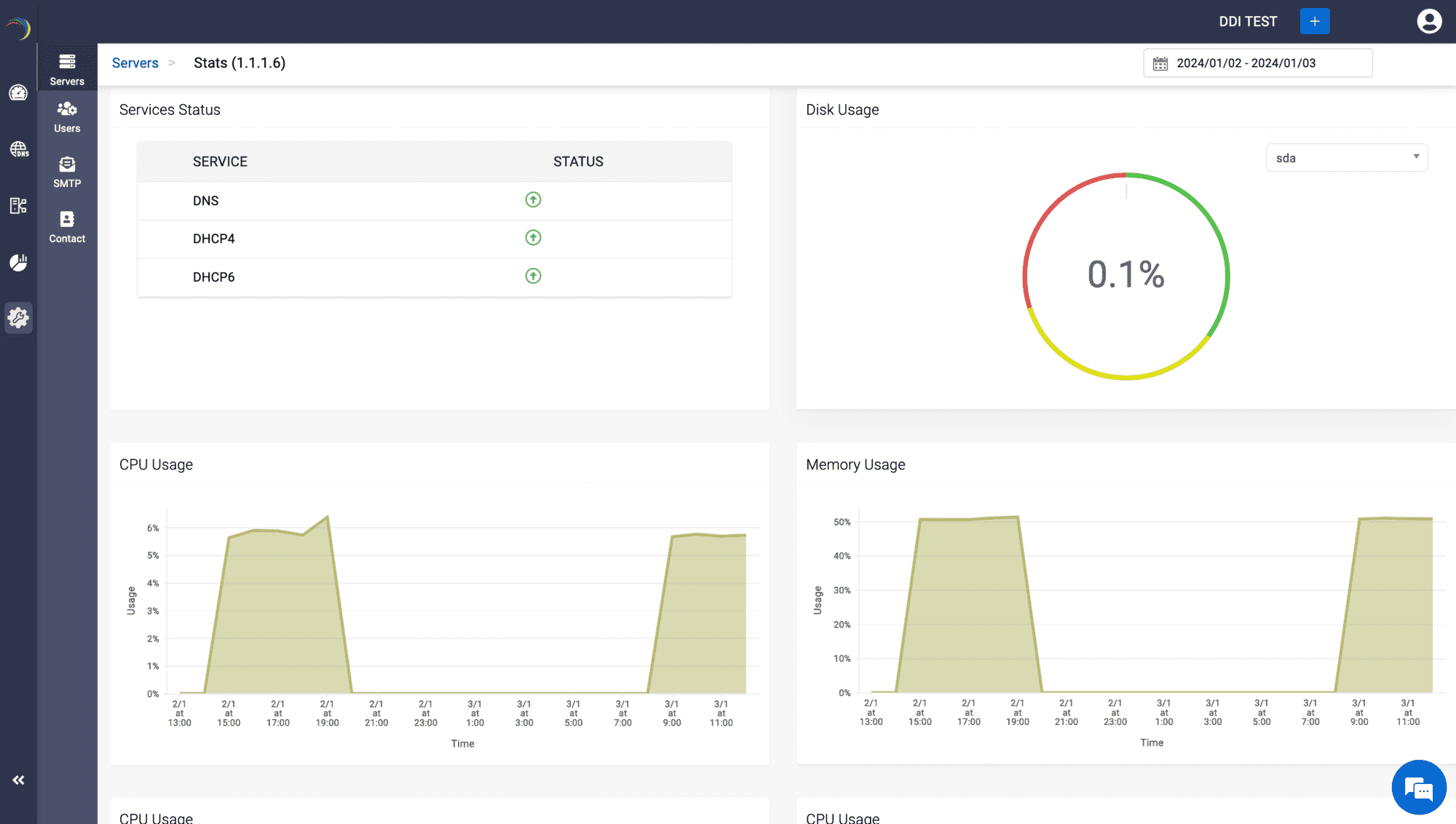 DDI Central also gives a visual snapshot of your server's load, health and performance in terms of the CPU, the memory, and the disk percentages of your server. These metrics represent different aspects of the server's system resource usage, each playing a unique role in the server's overall performance. Understanding the differences between them can help diagnose performance issues or guide system upgrades.