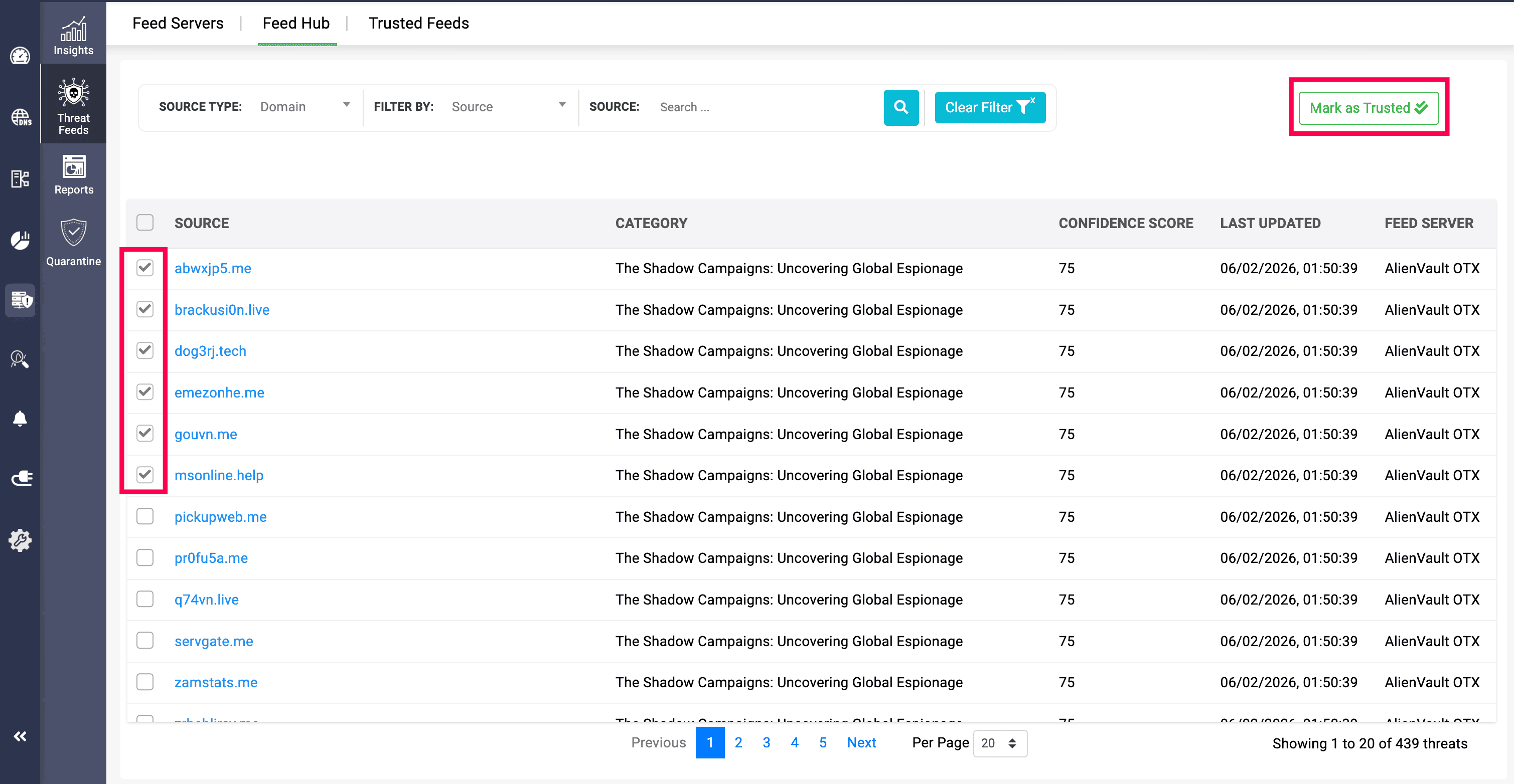 Administrators can select specific domains individually from the Threat Feed Hub and use the Mark as Trusted option to move them to the Trusted Feeds section within the application.