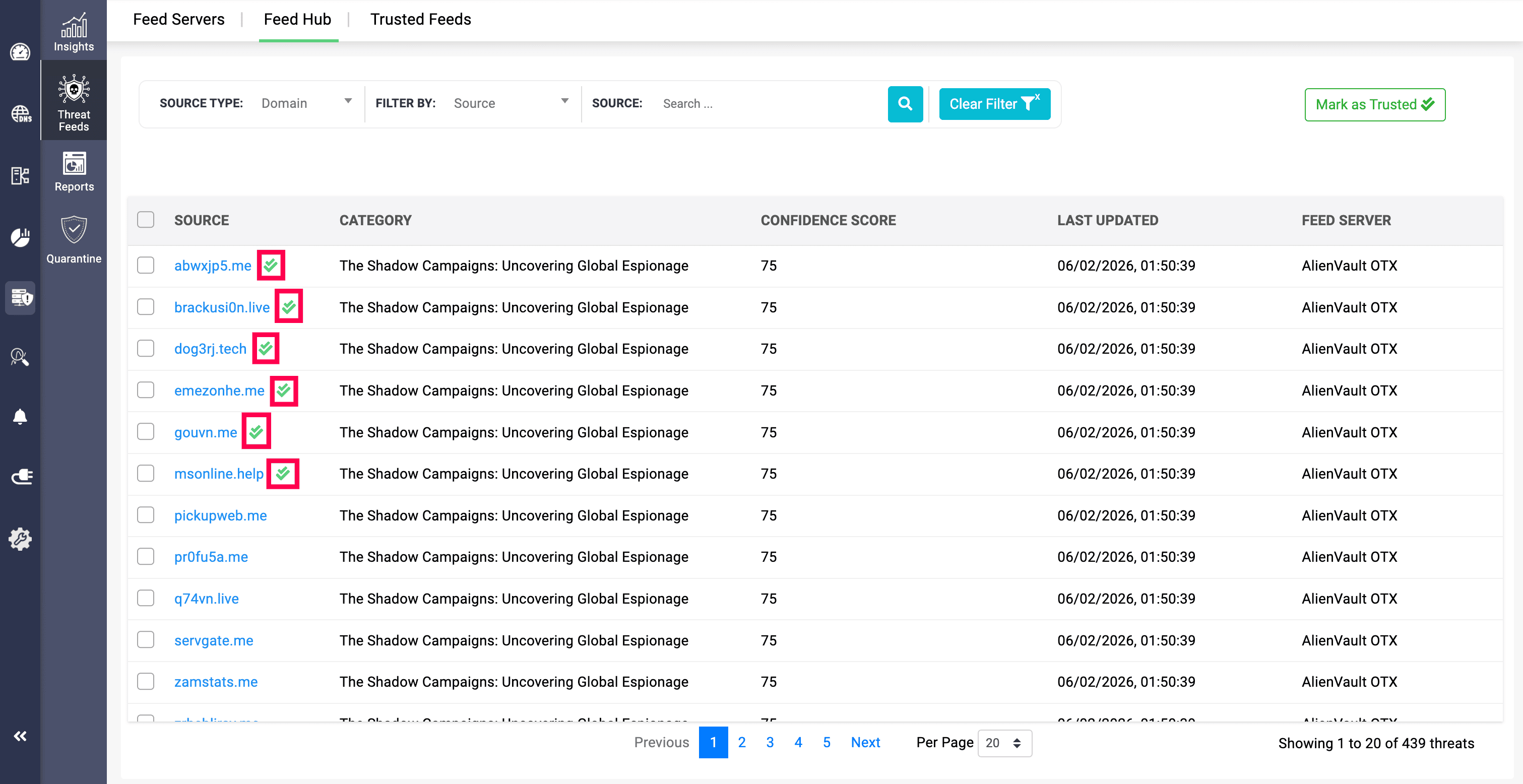 After confirmation, the selected domains will be marked with a green tick icon in the Feed Hub section, indicating that they are trusted.