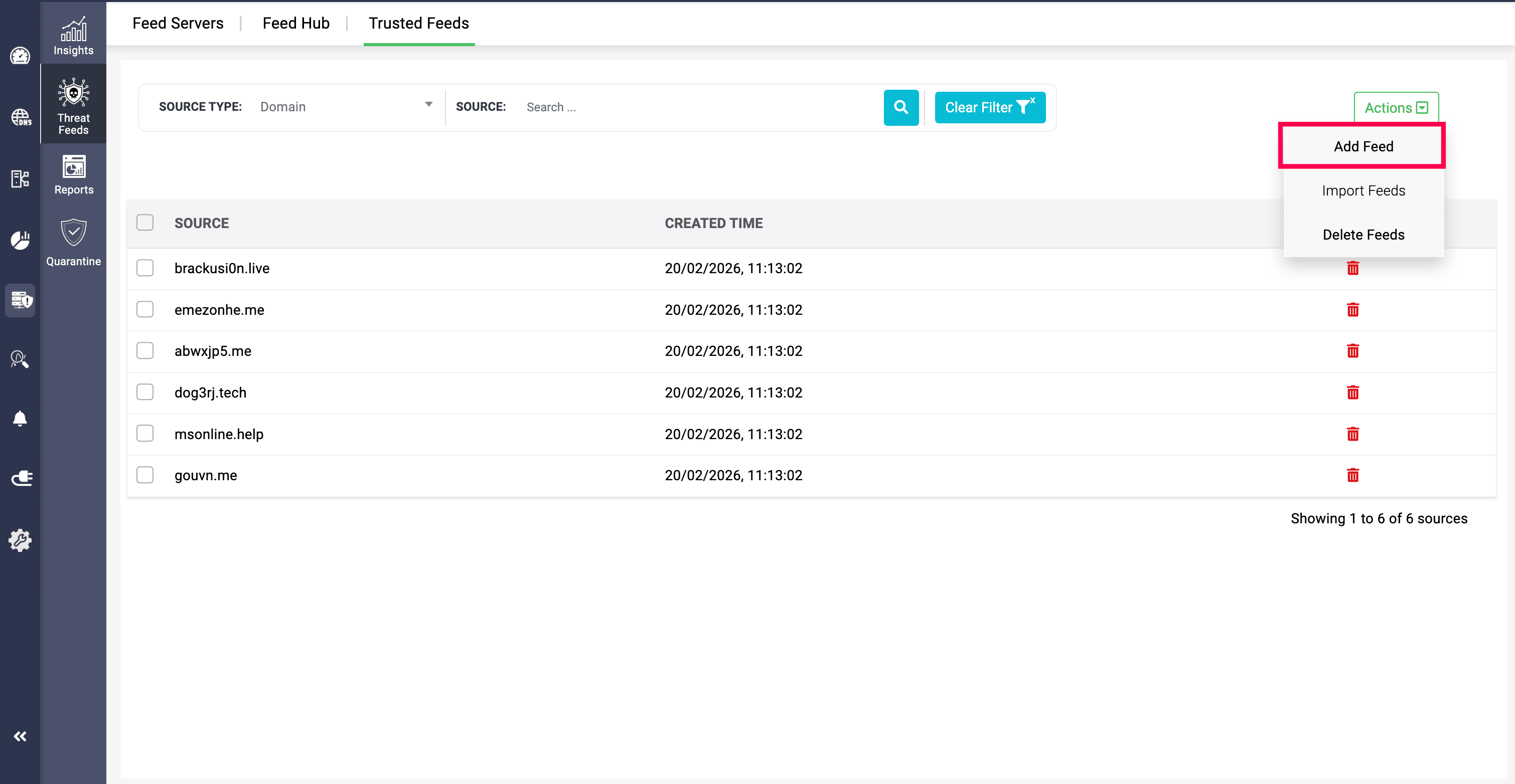 The Add Feed option allows admins to add domains directly to the Trusted Feeds section. They can enter domains that are not present in the Feed Hub, or add domains that already exist in the Feed Hub. If a domain from the Feed Hub is added here, it is automatically marked as Trusted in the Feed Hub.