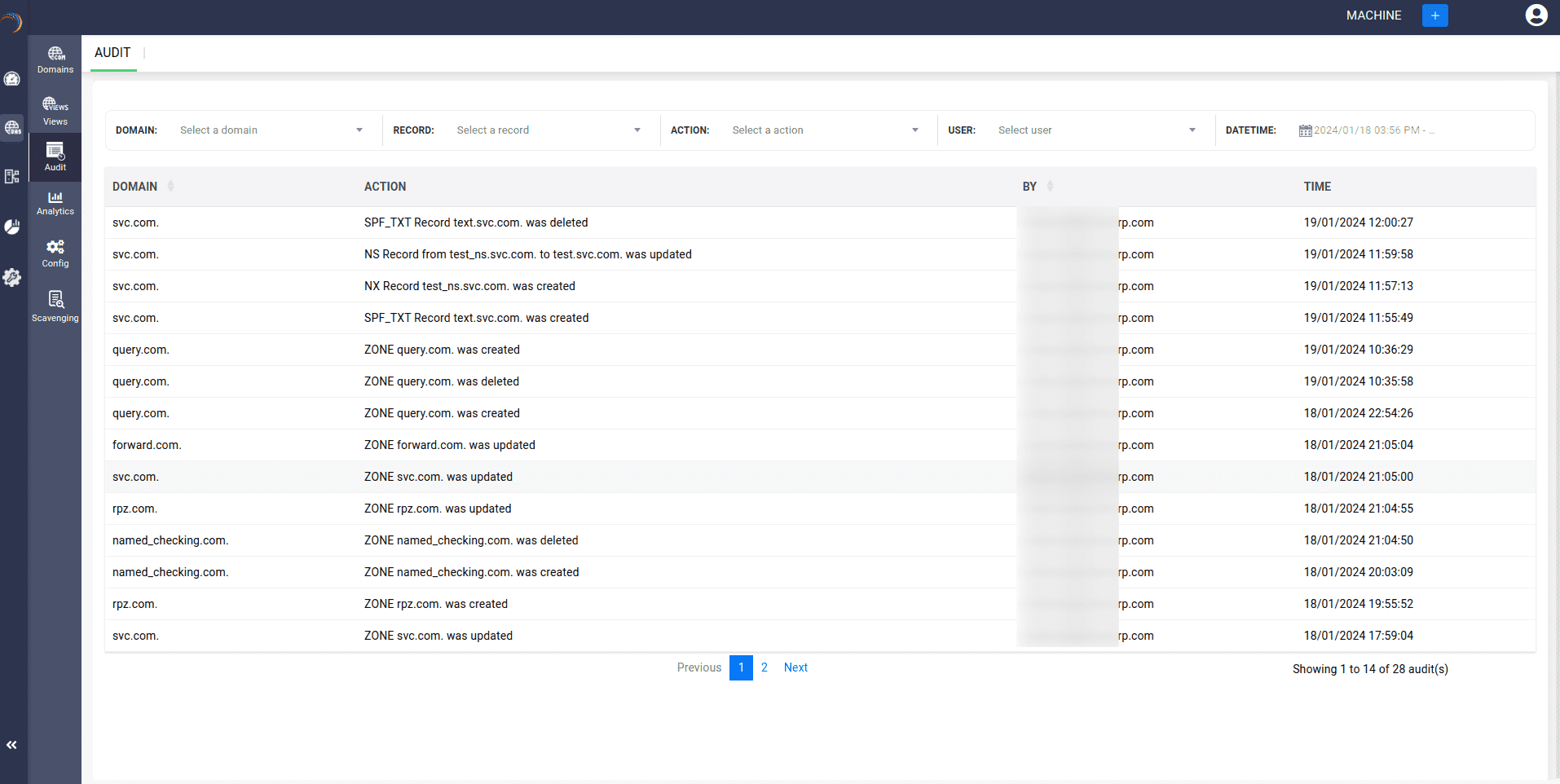 The Audit page helps you to continuously evaluate the overall security posture of your domains and records using security audit logs to track who, what, and when with respect to domain management and record updates.