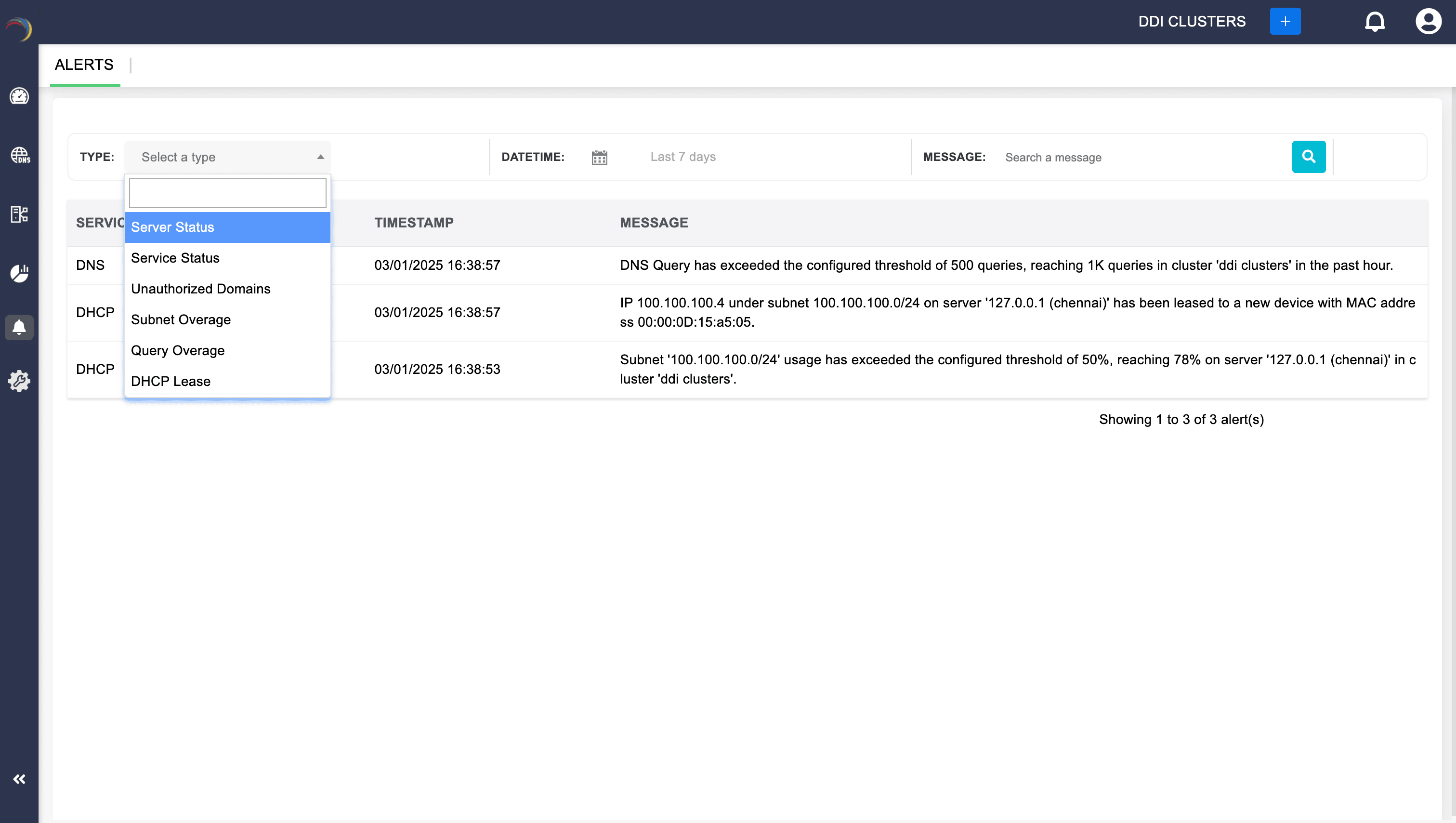 ManageEngine DDI Central facilitates real-time alerts for the administrators over the network issues occurring, within the UI alerts page as well as email notification. They can also view alerts history, audit every alerts came in the UI, helping administrators to analyze and investigate specific network issues.