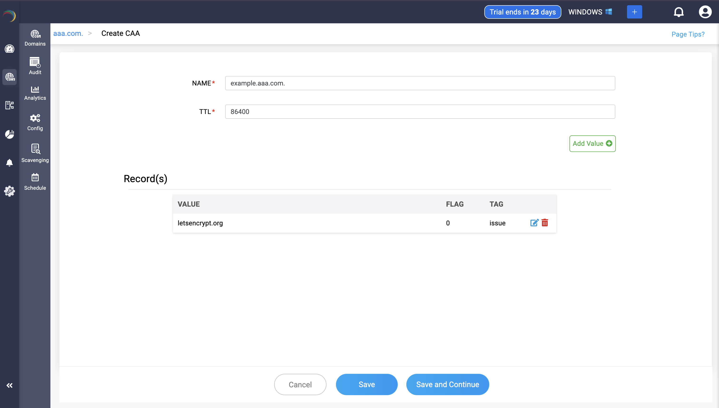 Step 3: Provide the details of the new CAA record, such as name, TTL, date and time, there are three values in the Add Value section.