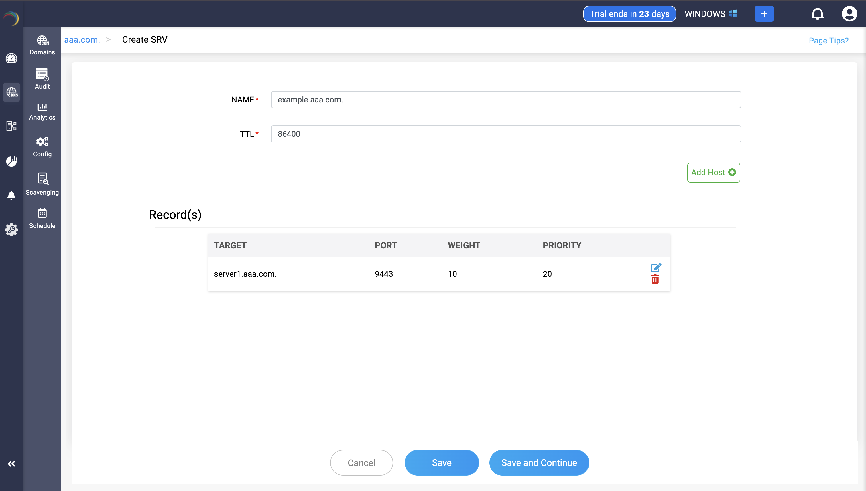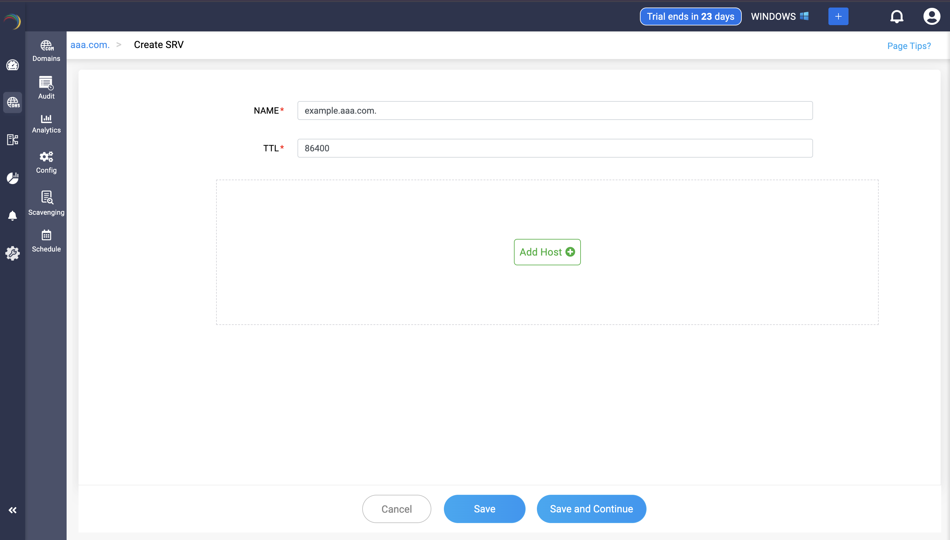 Step 3: Provide the details of the new SRV record, such as name, TTL, date and time. There are three fields in the Add Host field.