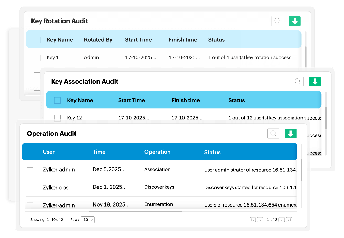 Maintain complete accountability of SSH key operations with comprehensive audit trails and activity monitoring. Key Manager Plus tracks each user's activity and records their actions along with timestamps, enabling administrators to identify suspicious behavior quickly and take appropriate remedial actions. Key Manager Plus features dedicated audits for key rotation, key association, discovery, and schedule operations to capture every detail of activities performed.
