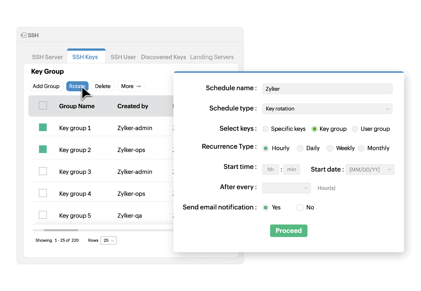 Execute bulk operations efficiently when managing large volumes of SSH keys across your infrastructure. With Key Manager Plus, you can organize keys into groups and set up bulk/group processes to handle multiple operations simultaneously. Whether associating, creating, or deploying keys, you can complete tasks in just a few steps.