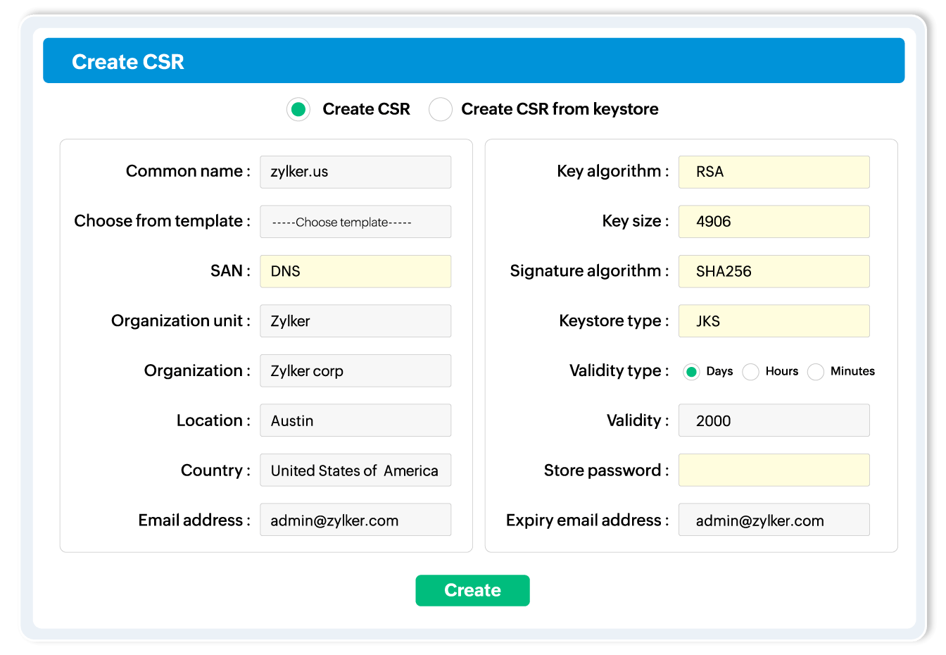 Create CSRs directly within Key Manager Plus without external tools. Enter certificate details manually or use preconfigured templates to standardize CSR generation across your organization. You can generate CSRs from scratch or import them from external sources to consolidate and track all certificate requests from one platform.