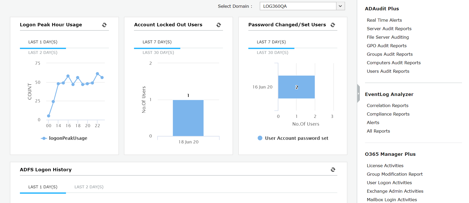 • Apart from all this, Log360 also takes care of your organization's cloud environment security and lets you gain visibility into your AWS, Azure, Salesforce, and Google Cloud Platform cloud infrastructures. It lets you monitor changes to your users, network security groups, virtual private clouds, permission changes, and more that occurs in your cloud environment in real time.