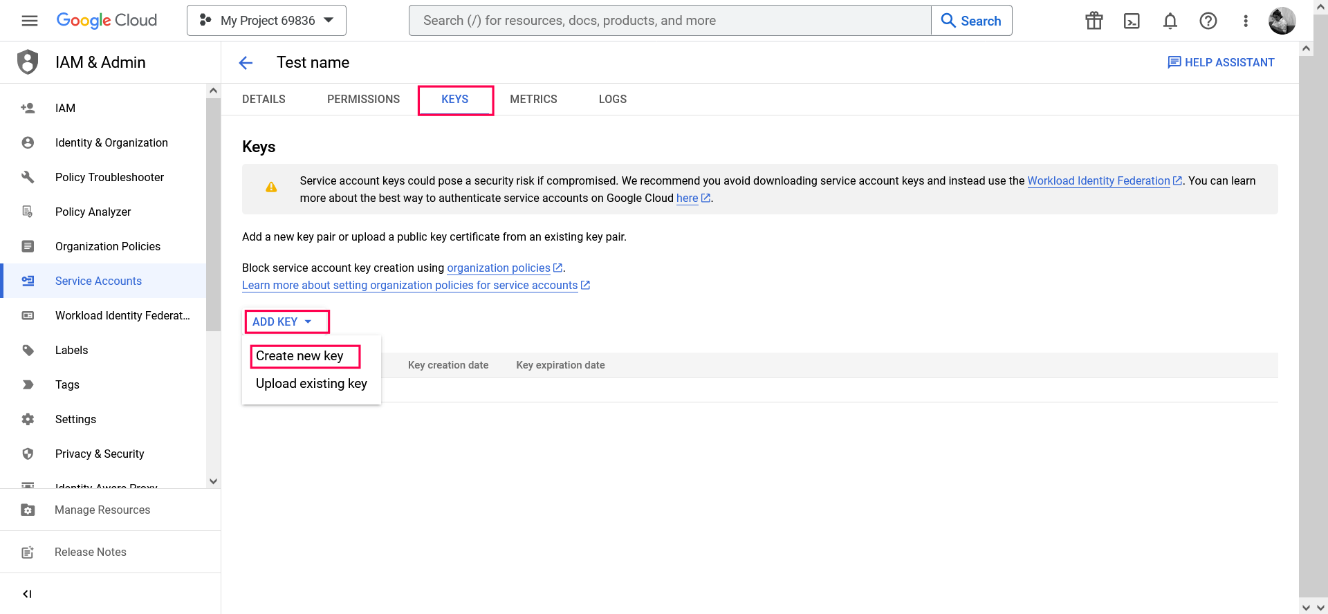 - Click + CREATE SERVICE ACCOUNT button from the top navigation bar.