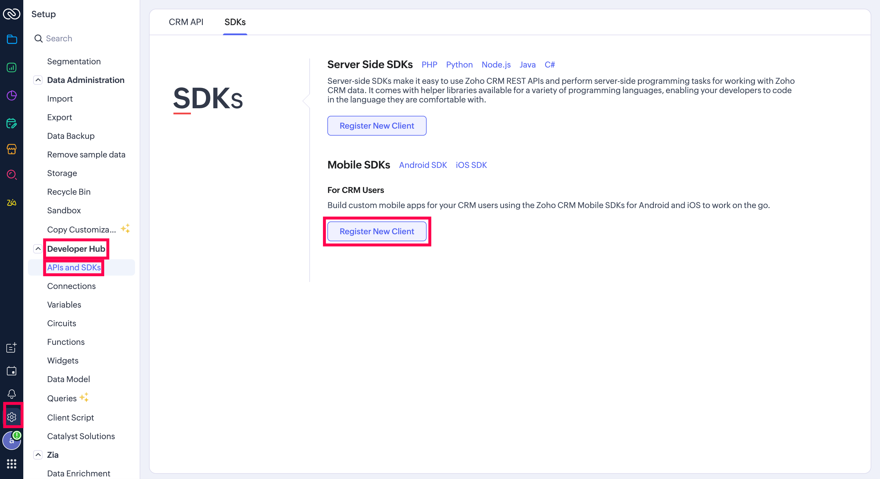 - Login to Zoho CRM using your Zoho Account and click on Settings from the menu. Click on APIs and SDKs, present under Developer Hub.