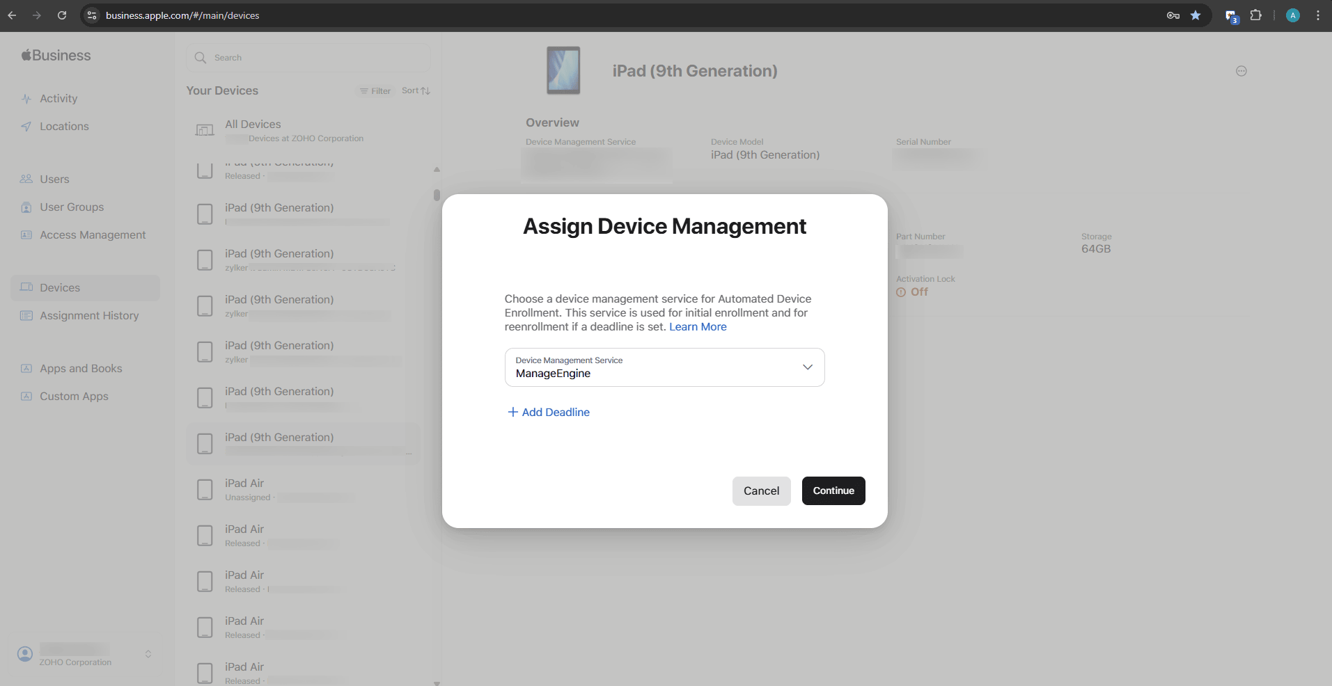 - In the Assign Device Management , choose ManageEngine under the Device Management service to set it as the server.