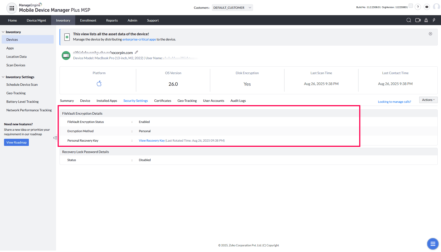 - Verify FileVault Recovery Key (macOS): Navigate to Inventory → Mac Device → Security Settings. Confirm the recovery key has rotated.