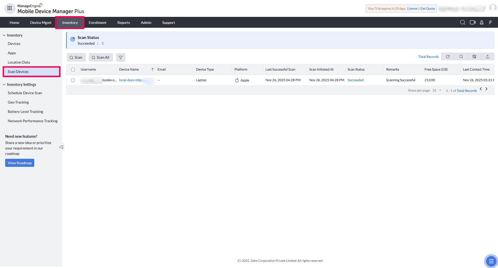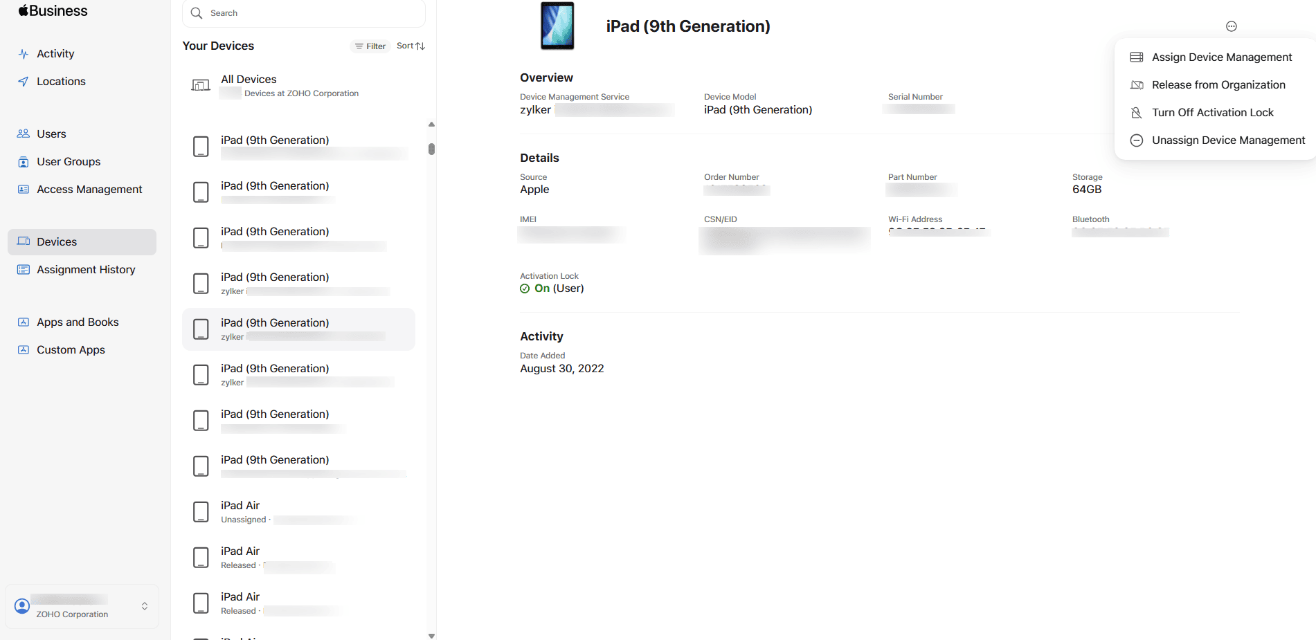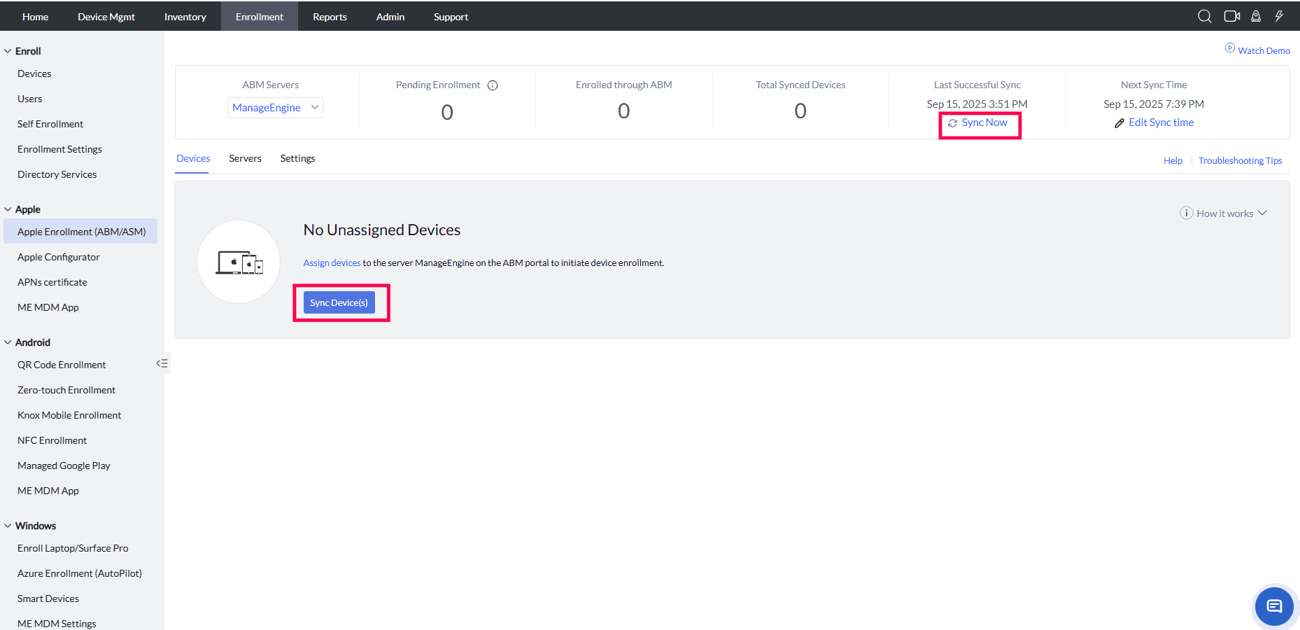 - Then, Sync devices in ManageEngine MDM console to fetch the updated assignments from ABM.